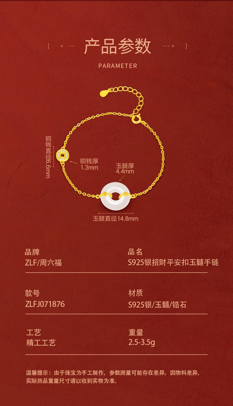 商品名称:周六福S925银招财平安扣玉髓手链ZLFJ071876