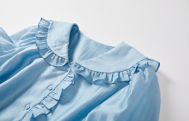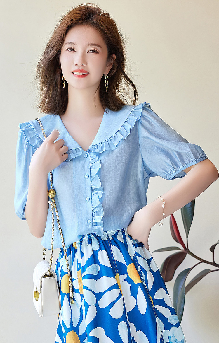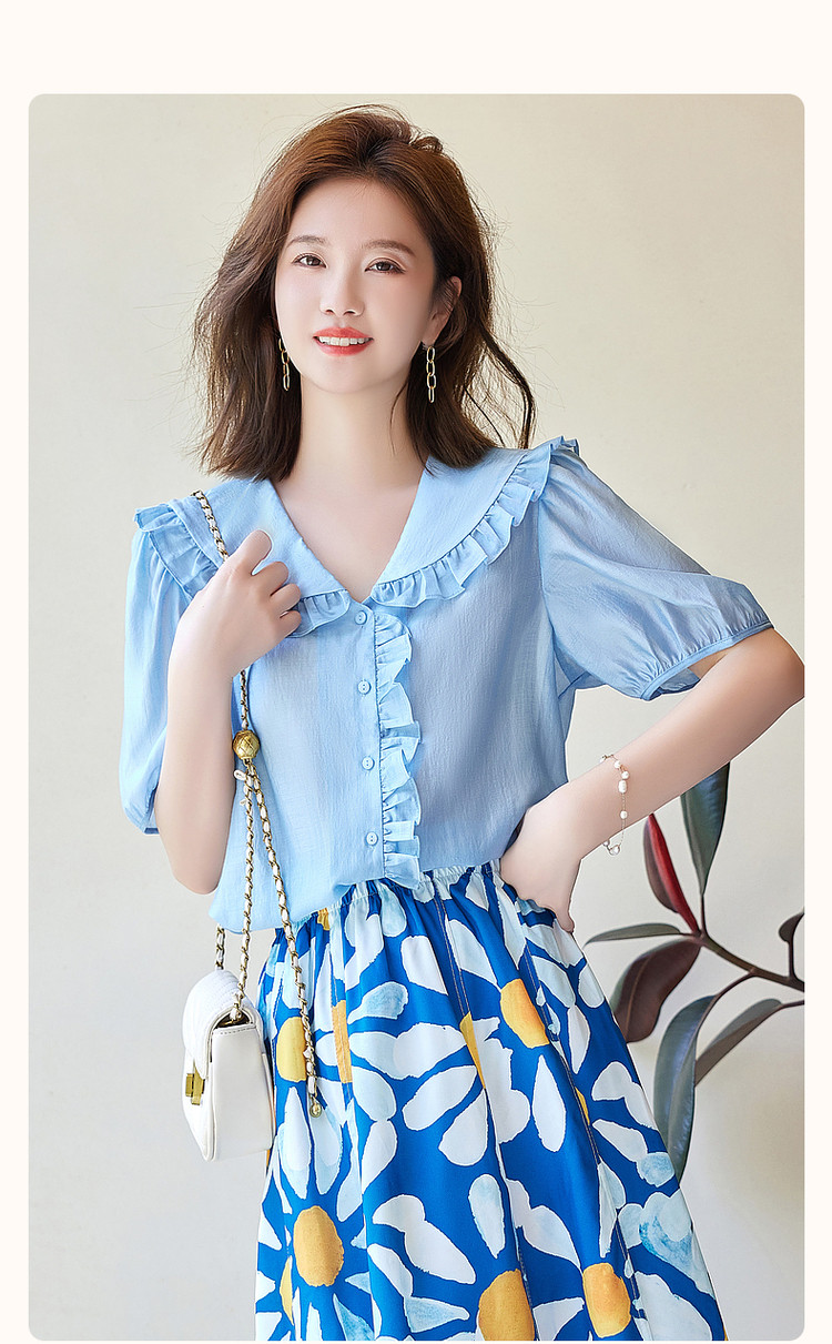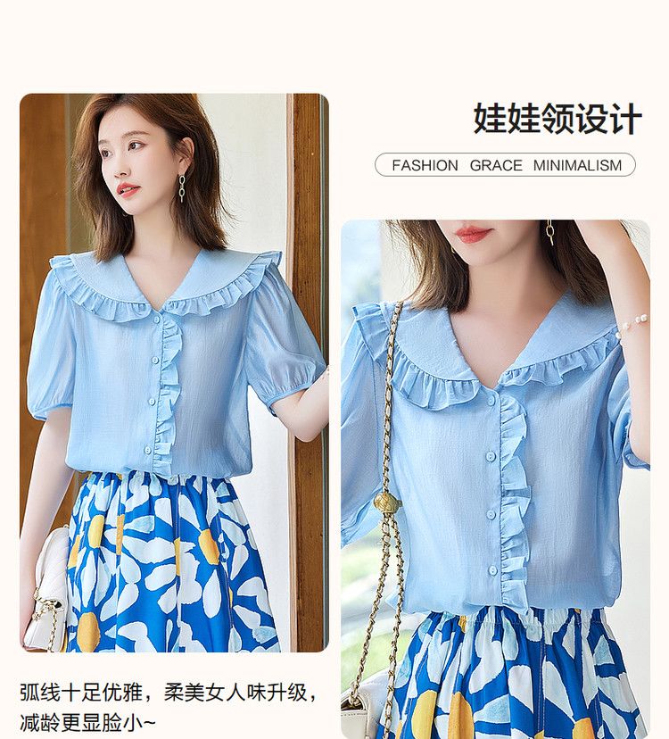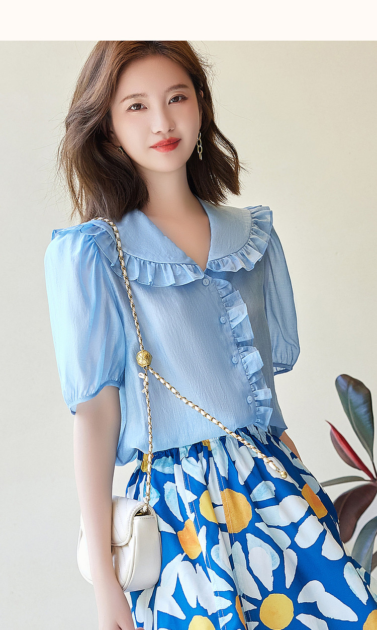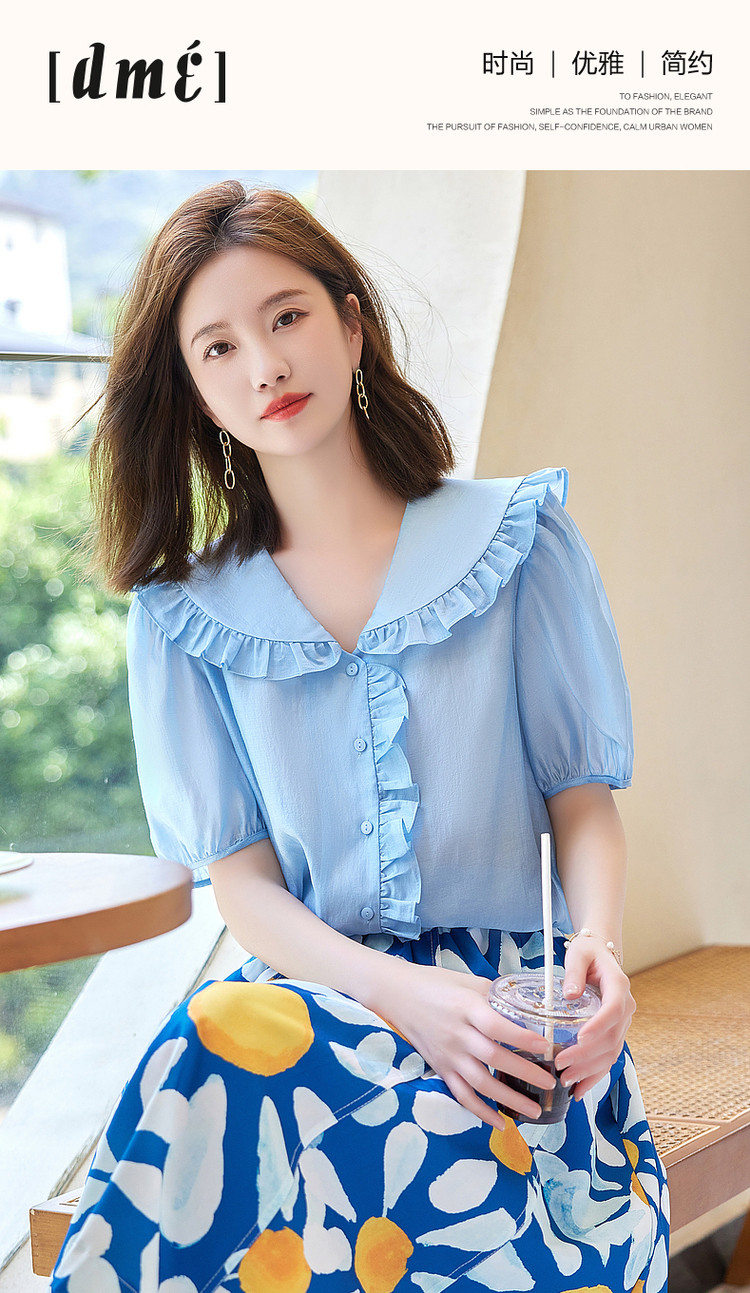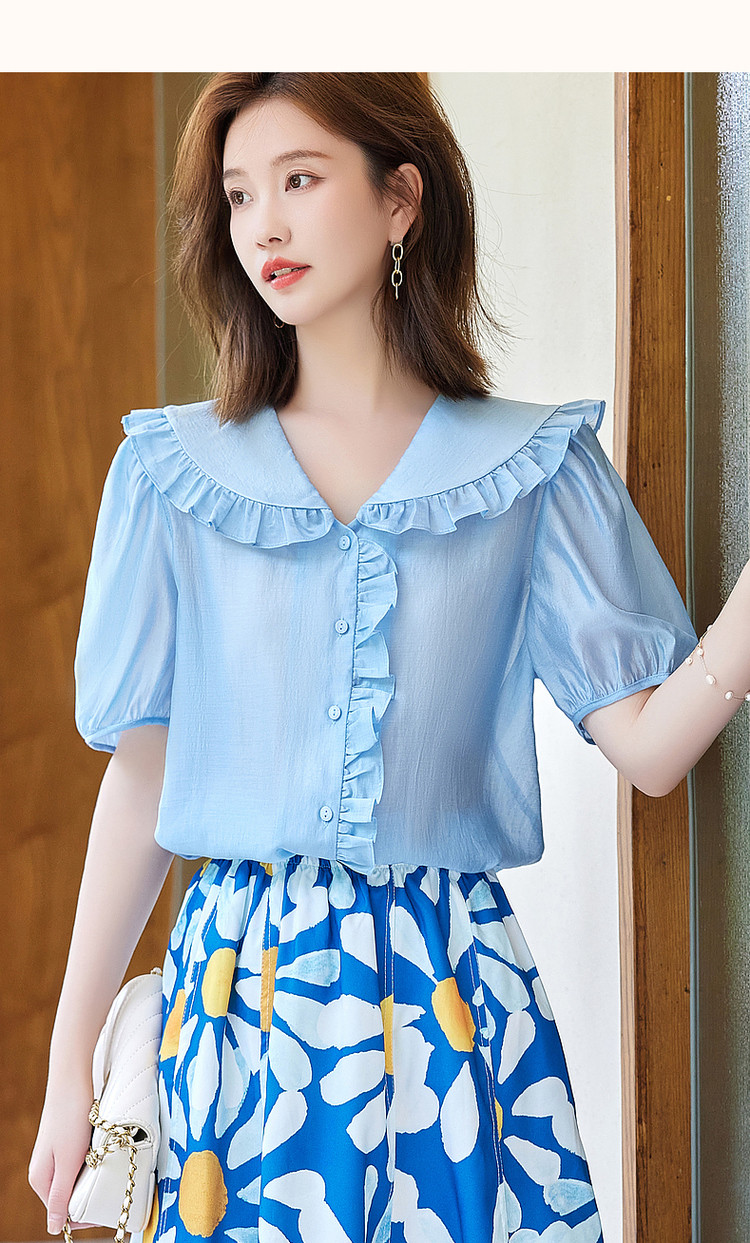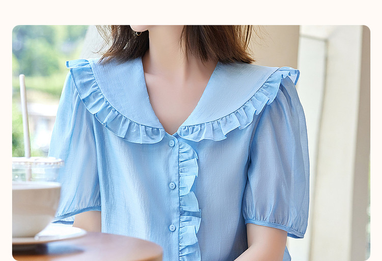 商品名称:【轻奢莱赛尔】夏季淑女娃娃领衬衫泡泡袖荷叶边气质衬衣女装上衣 435329
