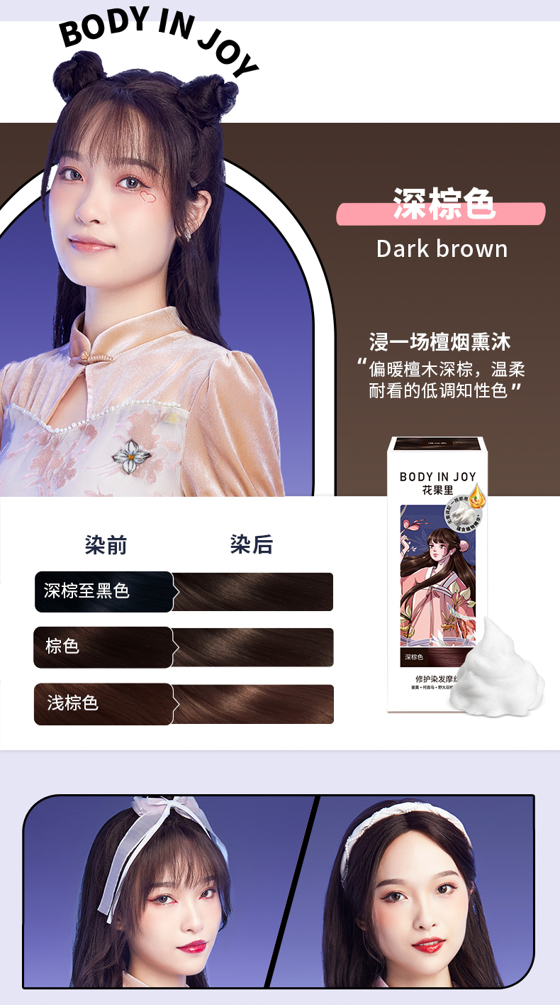 商品名称:BODY IN JOY/花果里国潮多爱修护染发摩丝-深棕色70g*2瓶