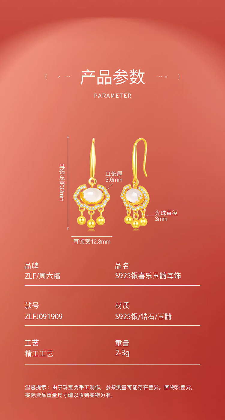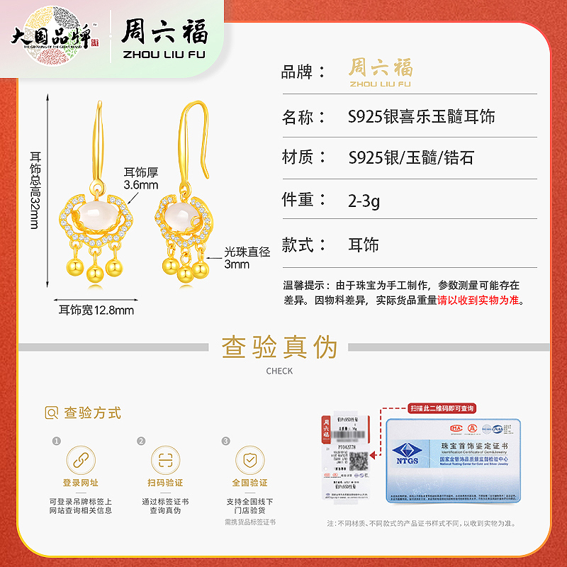 商品名称:周六福S925银喜乐玉髓耳饰ZLFJ091909