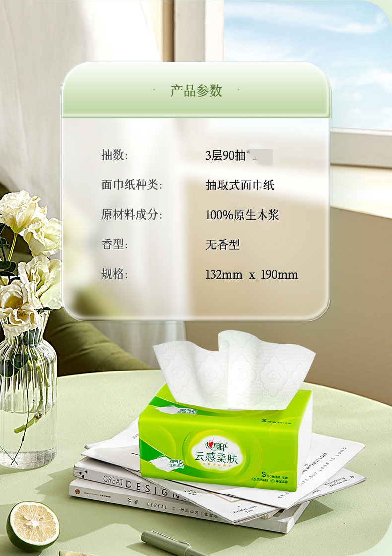 商品名称:心相印云感三层塑装面巾抽纸整箱90抽*24包DT17090
