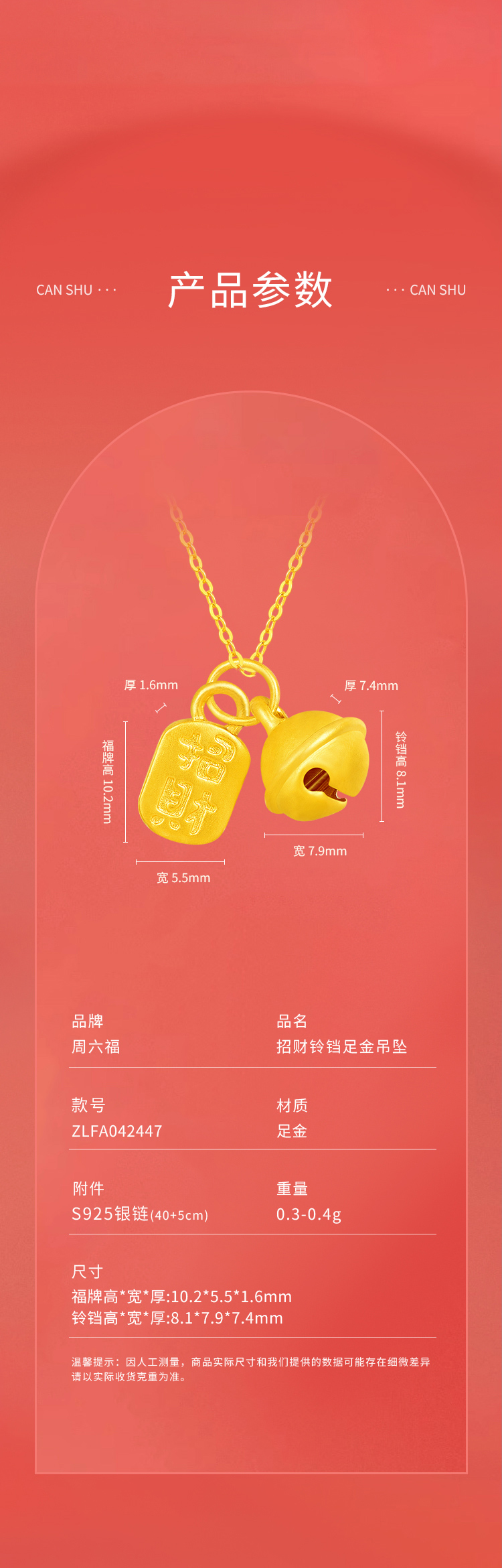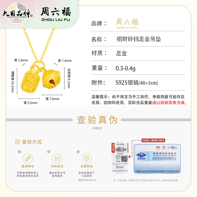 商品名称:周六福足金招财铃铛吊坠ZLFA042447