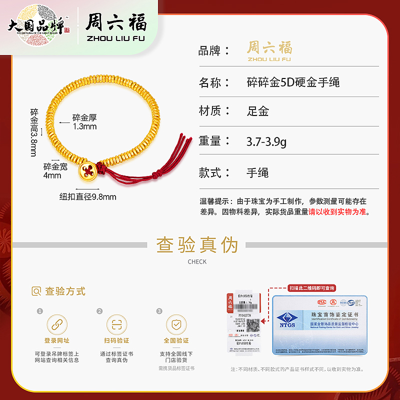 商品名称:周六福5D硬金碎碎金手绳ZLFA171967