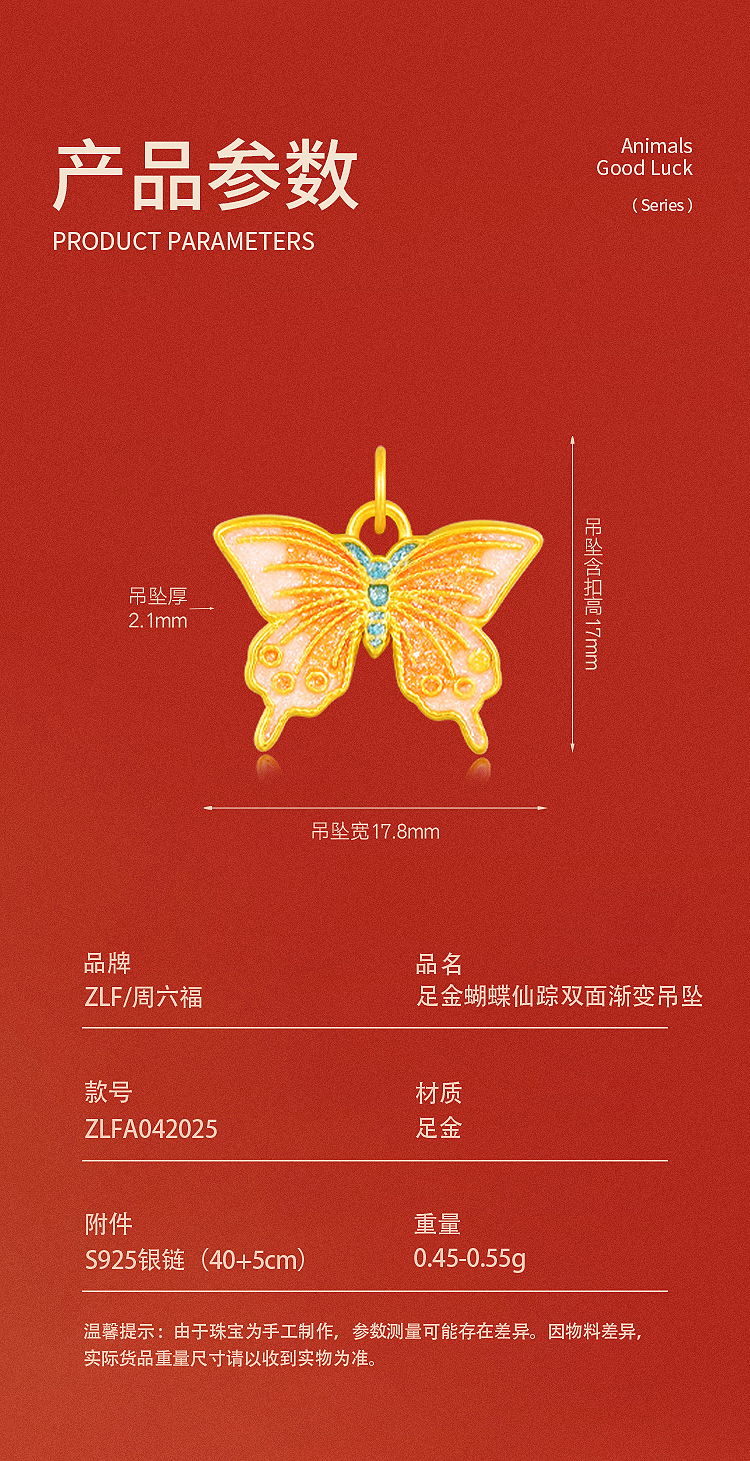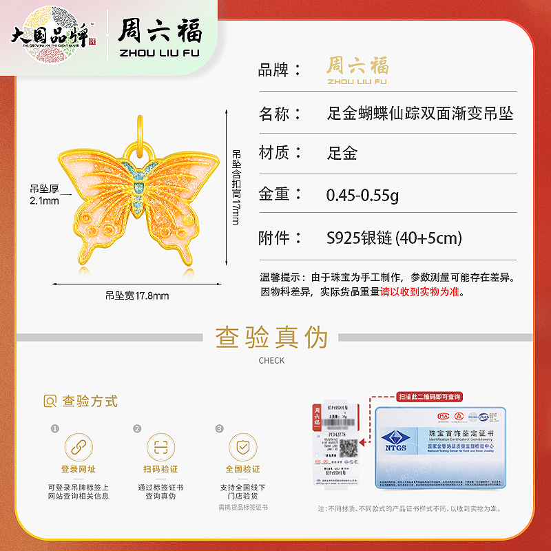 商品名称:周六福足金蝴蝶仙踪双面渐变吊坠ZLFA042025