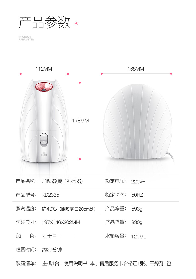 商品名称:K.SKIN/金稻蒸脸仪-雅士白KD2335
