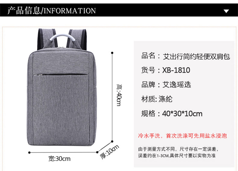 商品名称:艾逸瑶选艾出行简约轻便双肩包XB-1810