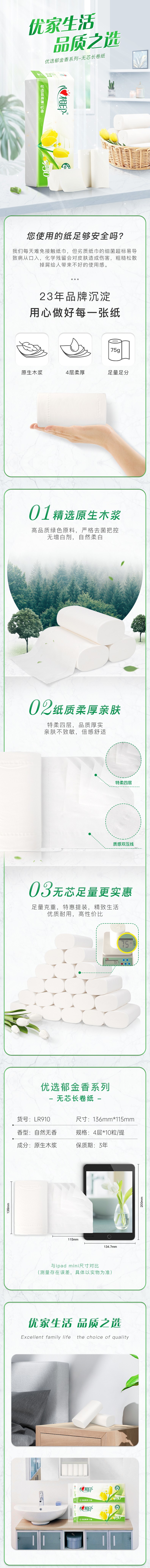 商品名称:心相印优选郁金香系列四层无芯卫生卷纸75g*10卷*1提LR910