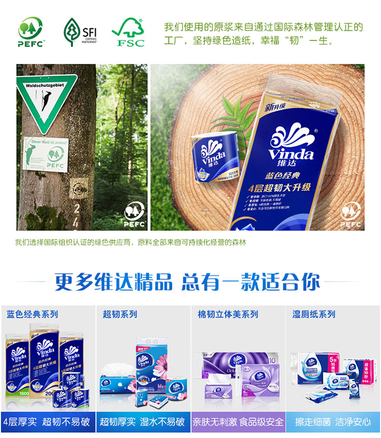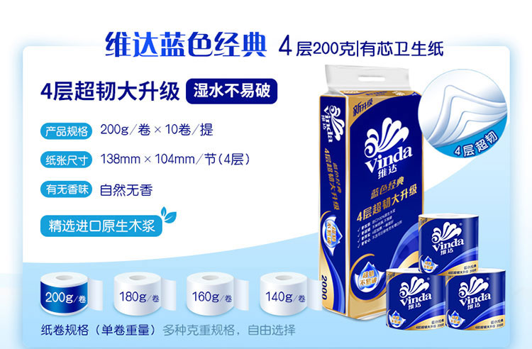 商品名称:Vinda/维达蓝色经典超韧有芯卷纸4层200g*10卷