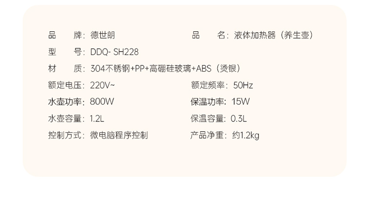 商品名称:DESLON/德世朗1.2升养生壶DDQ-SH228