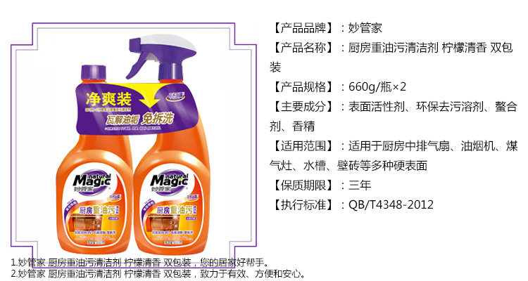 商品名称:妙管家厨房重油污清洁剂660g*2瓶 新老包装随机发货不接受指定
