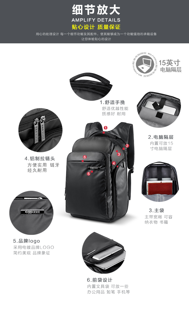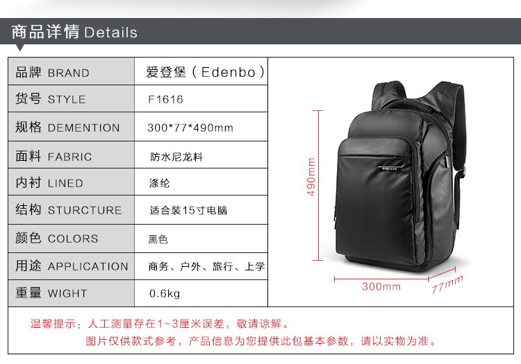 商品名称:Edenbo/爱登堡商务休闲双肩背包-黑色F1616