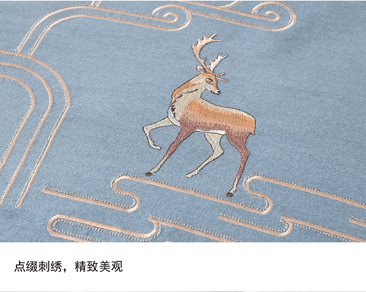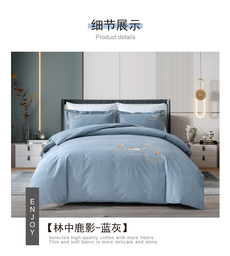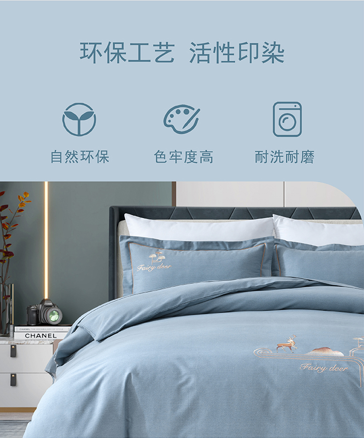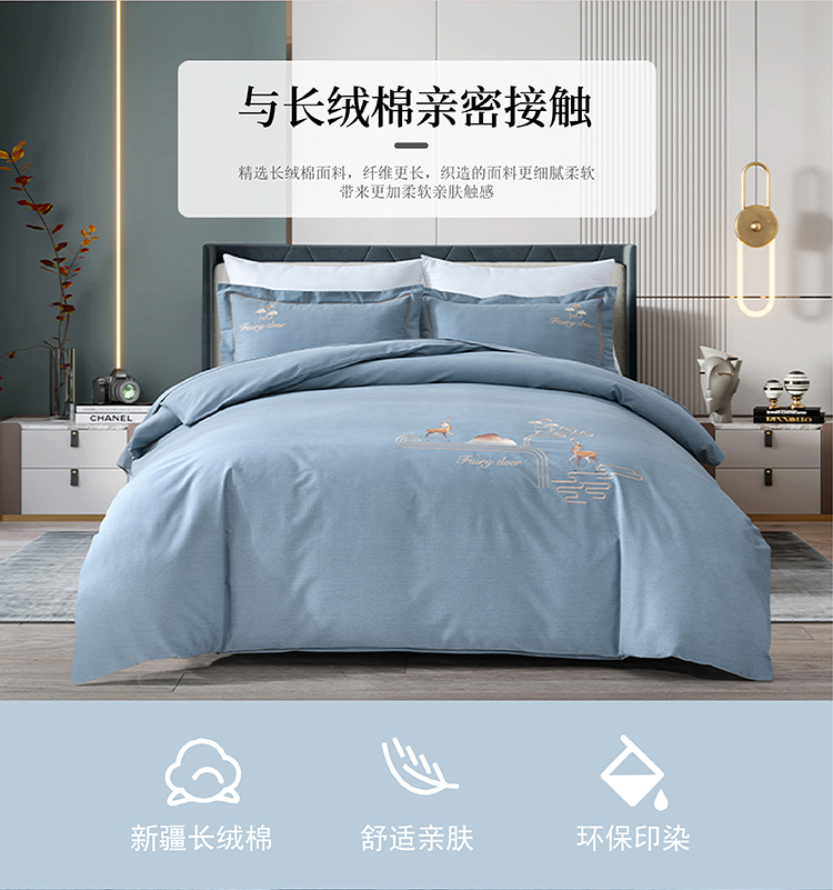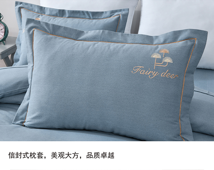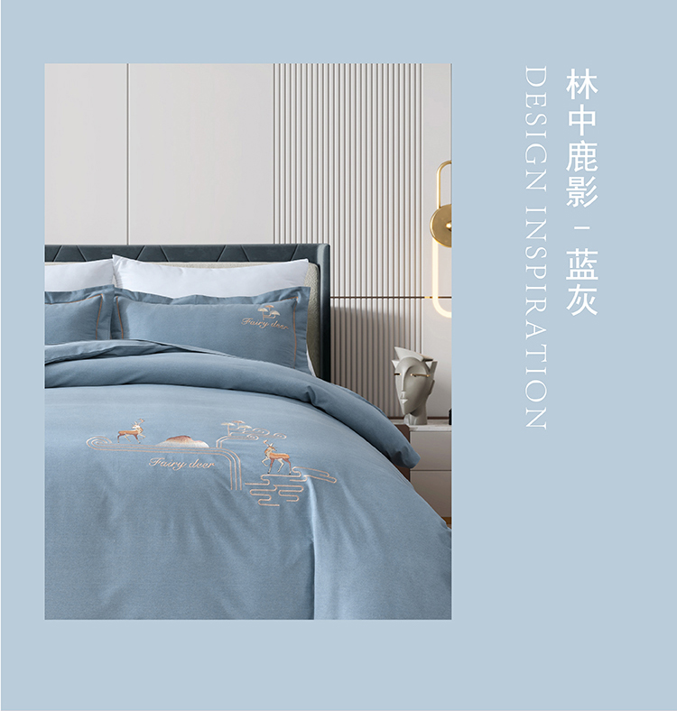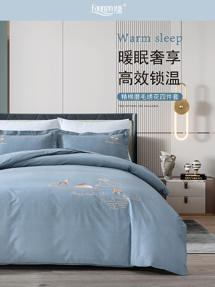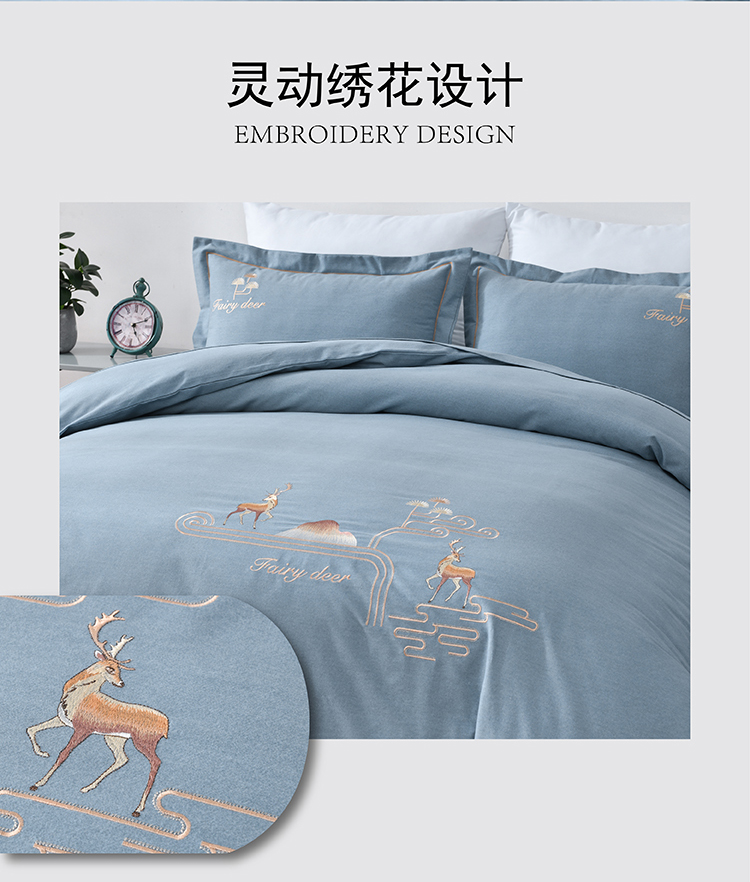 faunen/芳恩林中鹿影蓝灰精棉磨毛绣花床品四件套200*230cm