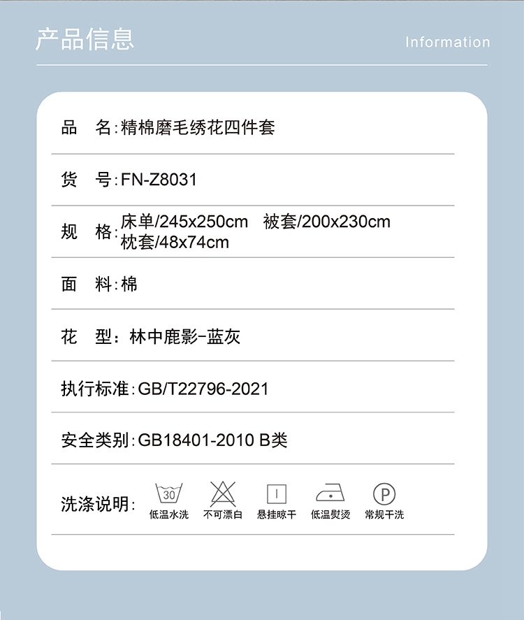 商品名称:faunen/芳恩林中鹿影蓝灰精棉磨毛绣花床品四件套200*230cm