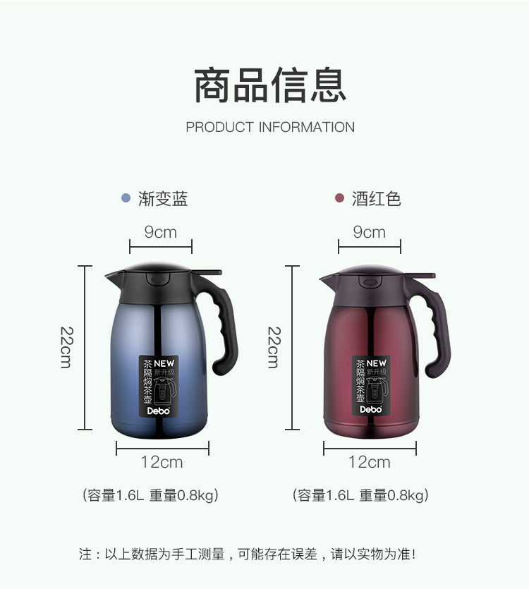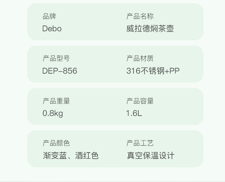 商品名称:Debo/德铂1.6升威拉德焖茶壶DEP-856