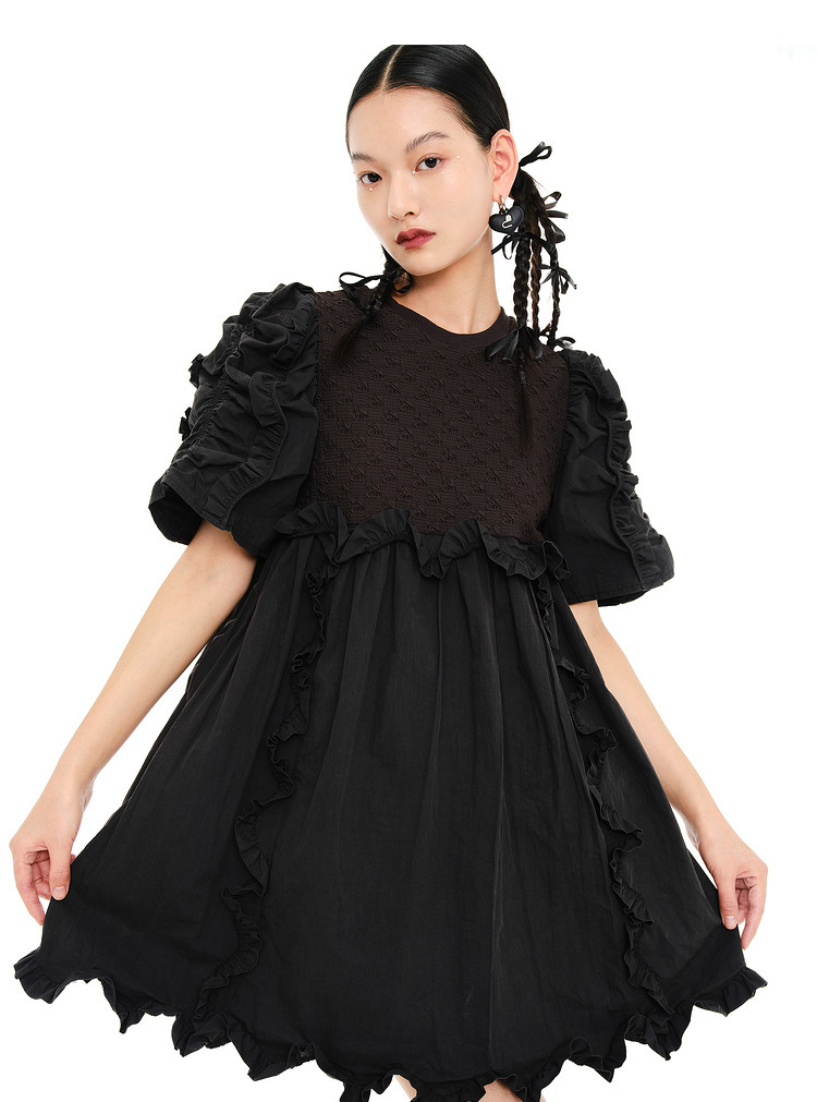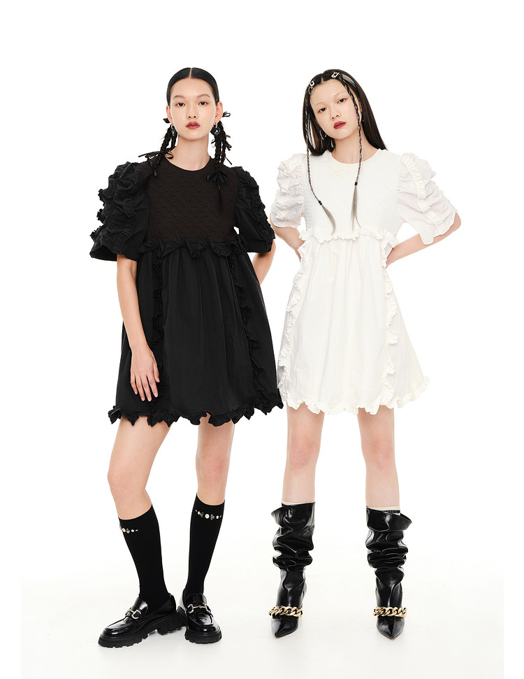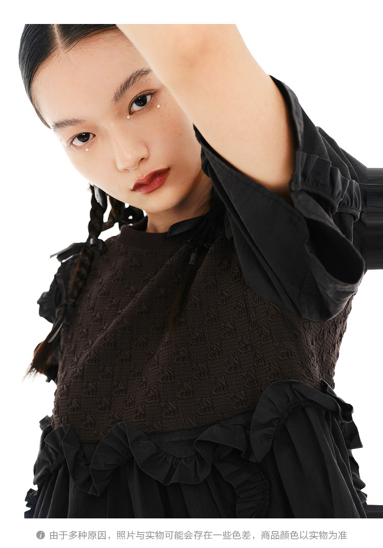 地素夏秋季专柜甜美纯色提花拼接荷叶边短袖连衣裙 074699