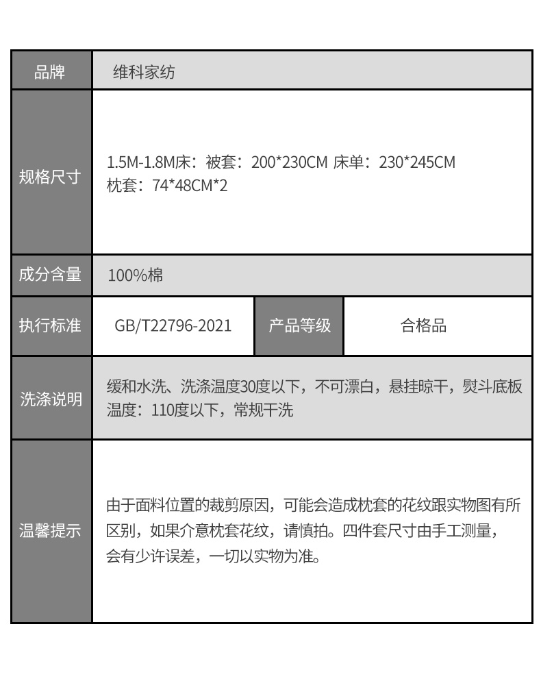 商品名称:VEKEN/维科家纺欧云全棉印花床品四件套200*230cm
