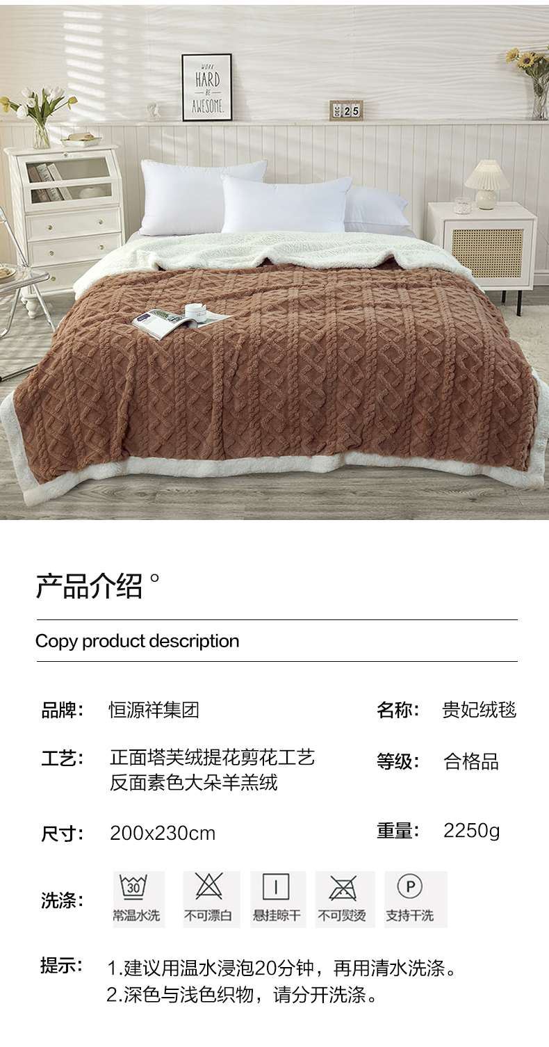 商品名称:恒源祥彩羊贵妃绒毯-咖色200*230cm 2250g