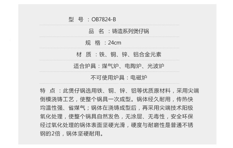 商品名称:omuda/欧美达24cm格特匠心重力铸造煲仔锅B款OB7824-B