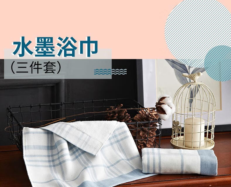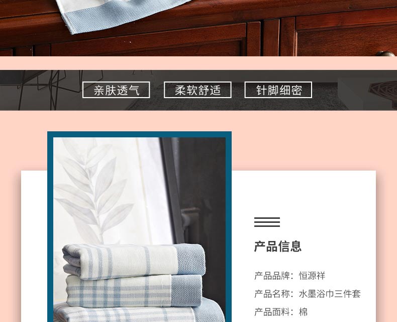 商品名称:【顺丰配送】恒源祥水墨亲肤棉毛巾浴巾三件套-蓝白格