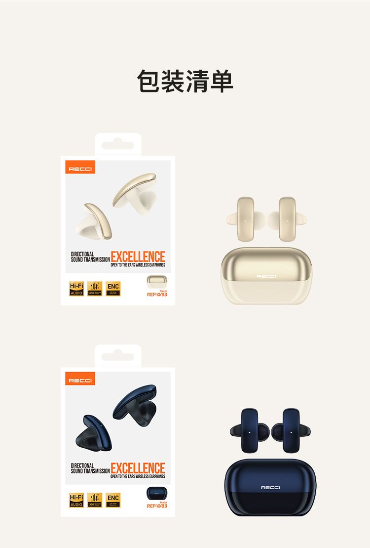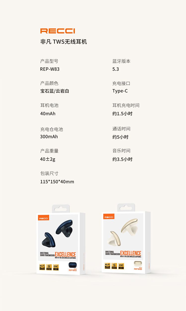 商品名称:RECCI锐思REP-W83无线耳机人体工学夹耳设计无感佩戴舒适贴耳久带不痛耳蓝牙耳机