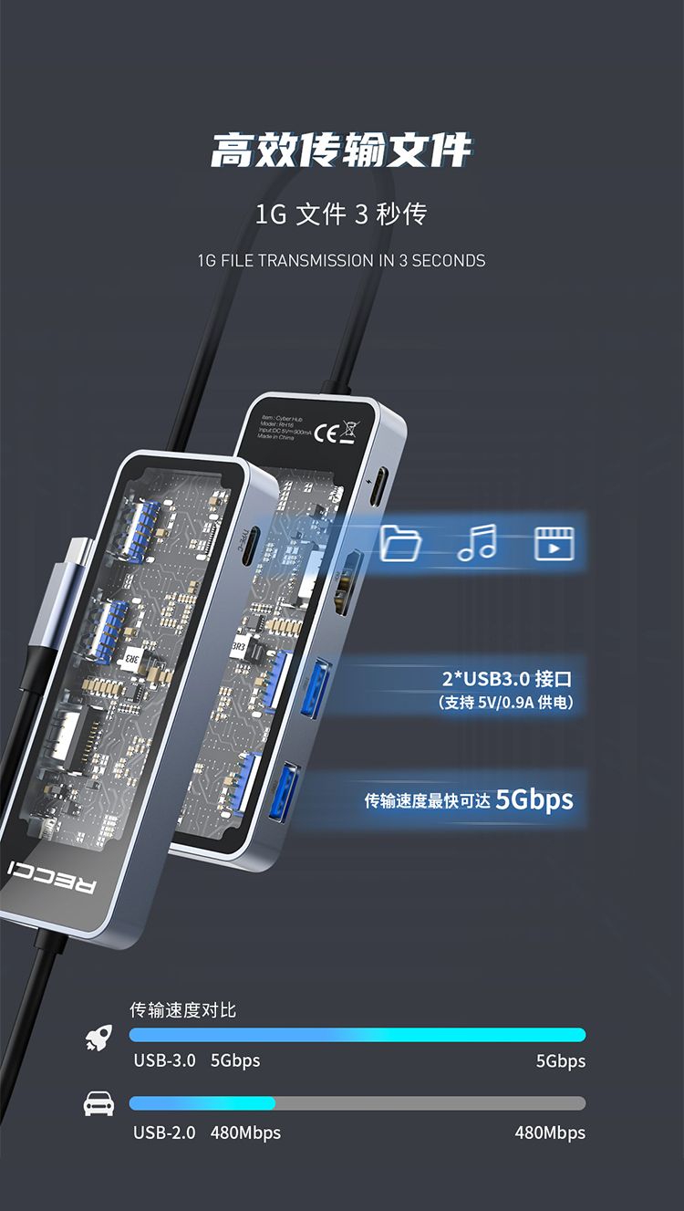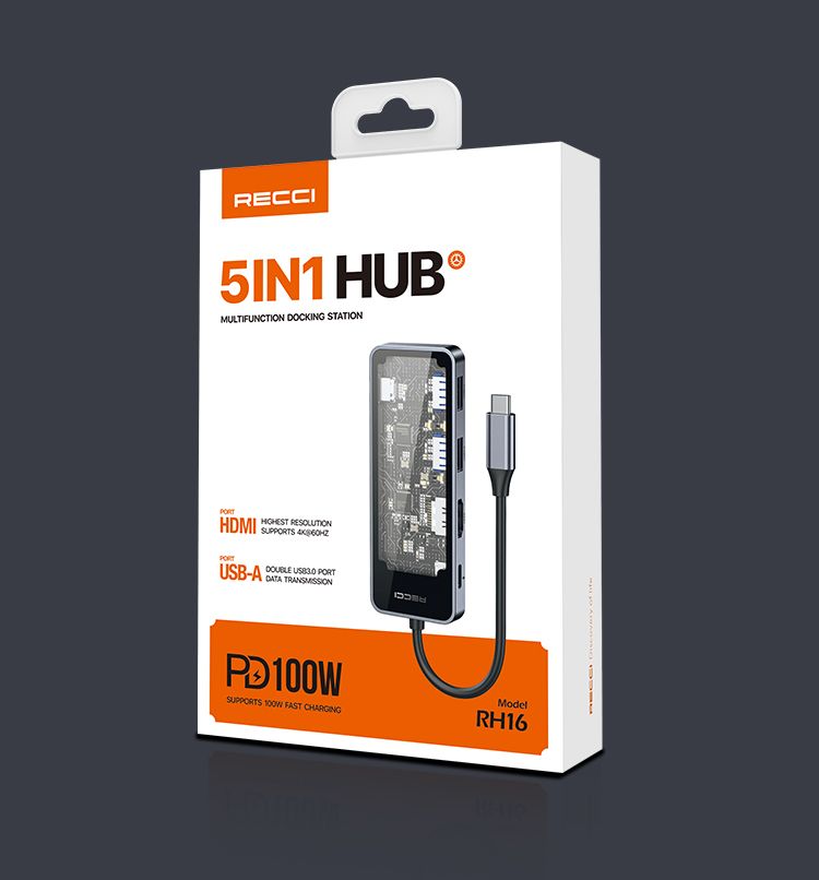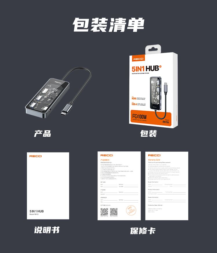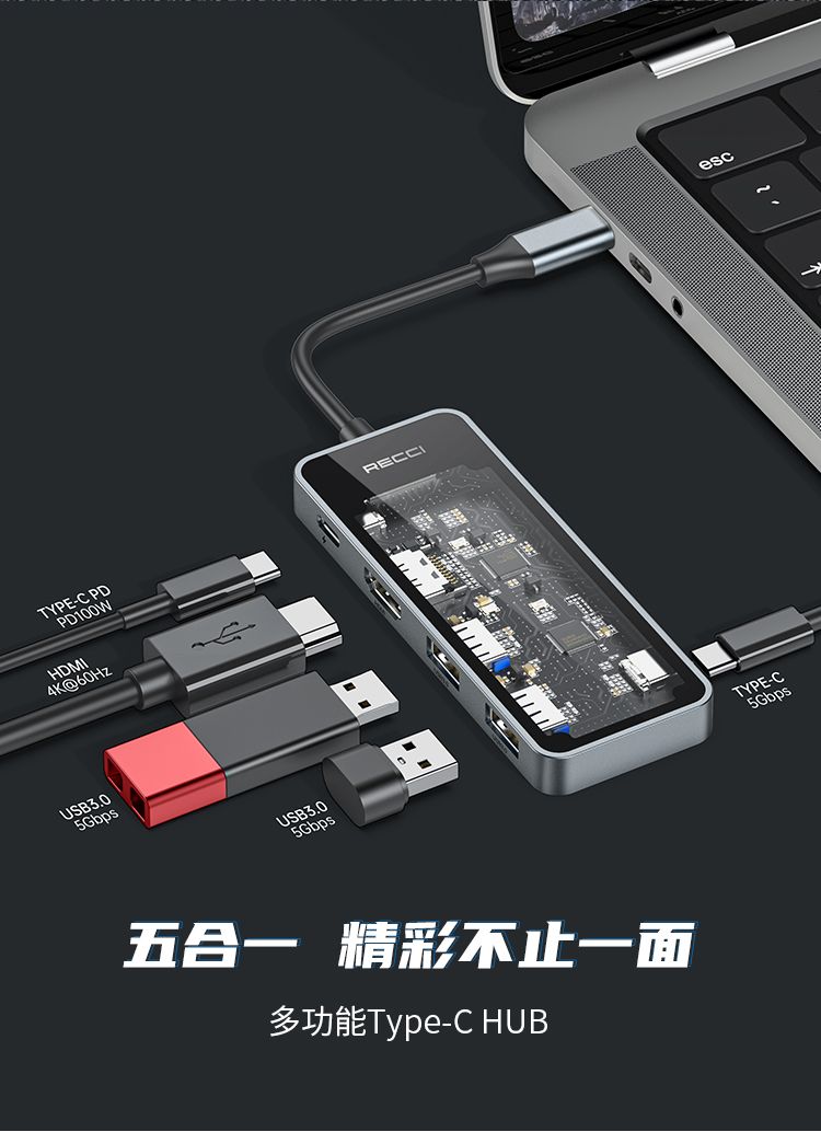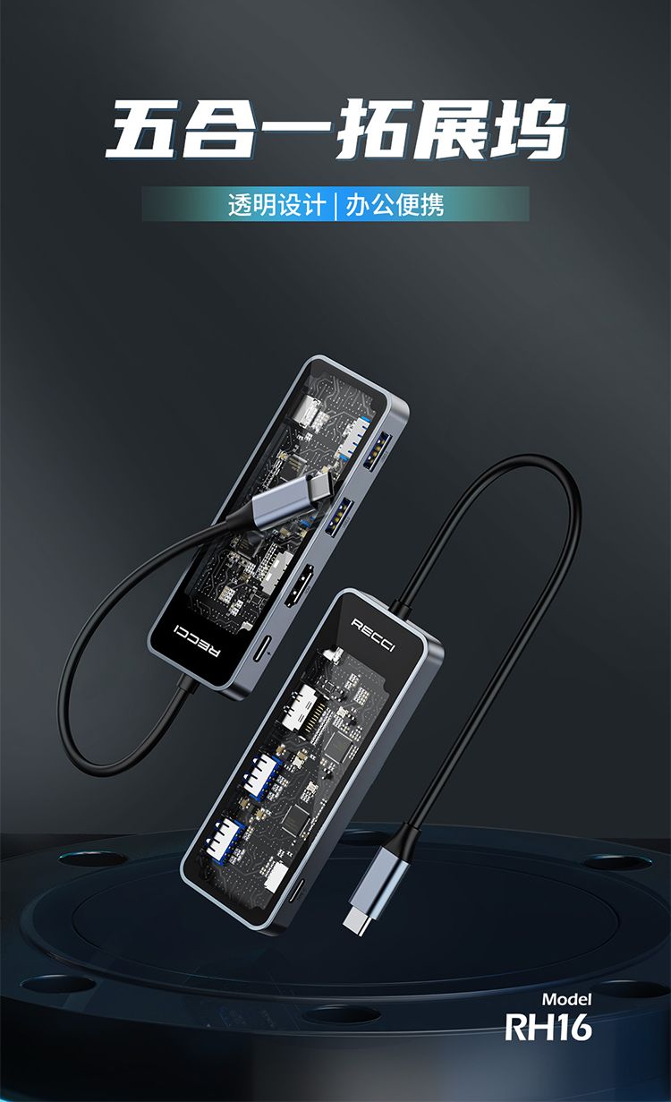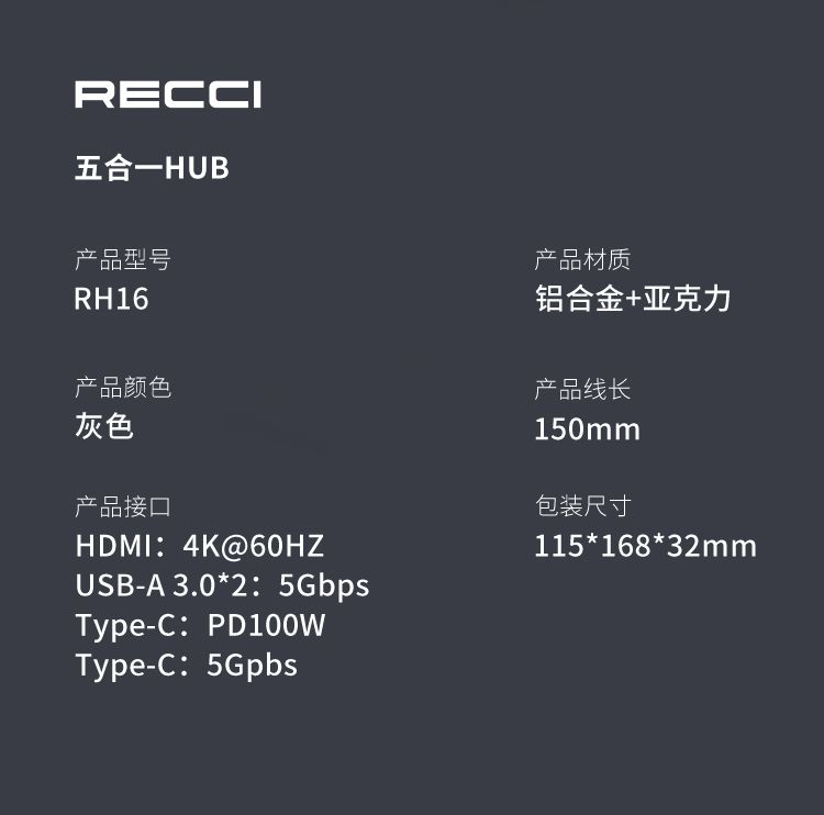 商品名称:RECCI锐思RH16数据线支持PD100W充电线转HDM五合一HUB