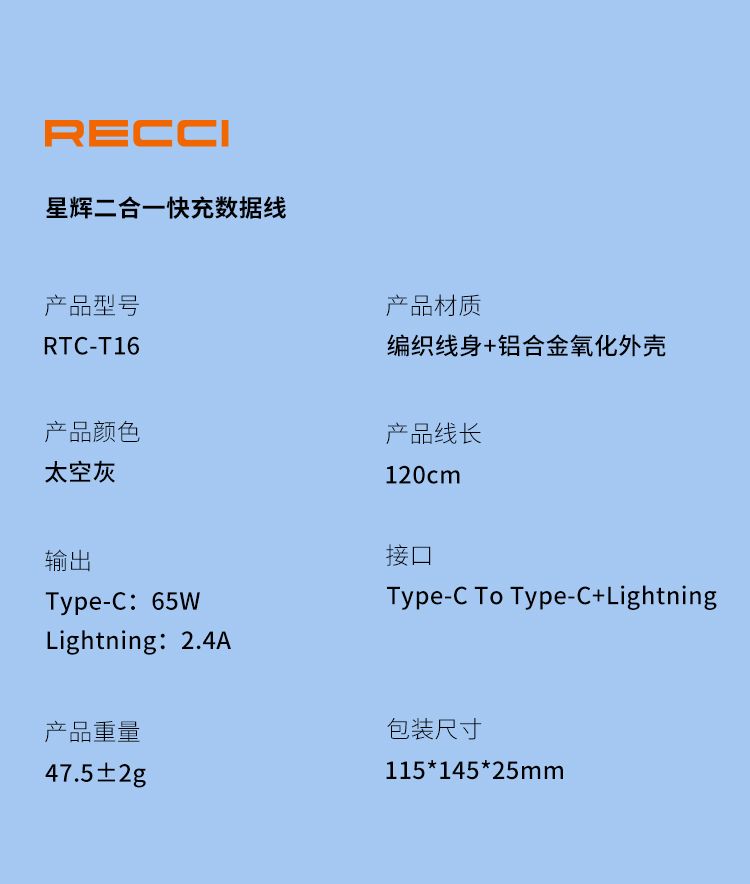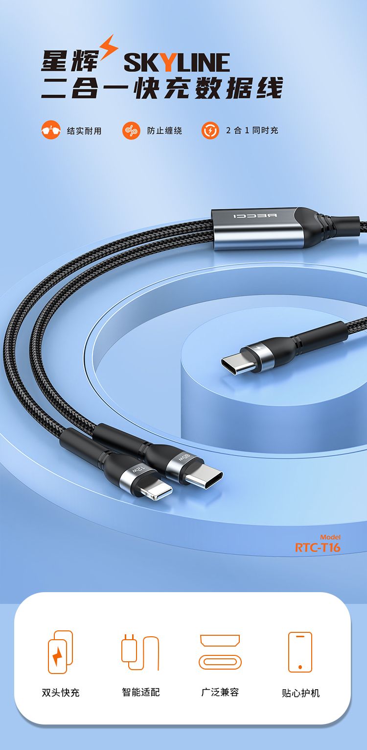 商品名称:RECCI锐思RTC-T16数据线二合一足支持Type-C口Lightning适用于苹果12/13/14/15兼容华为安