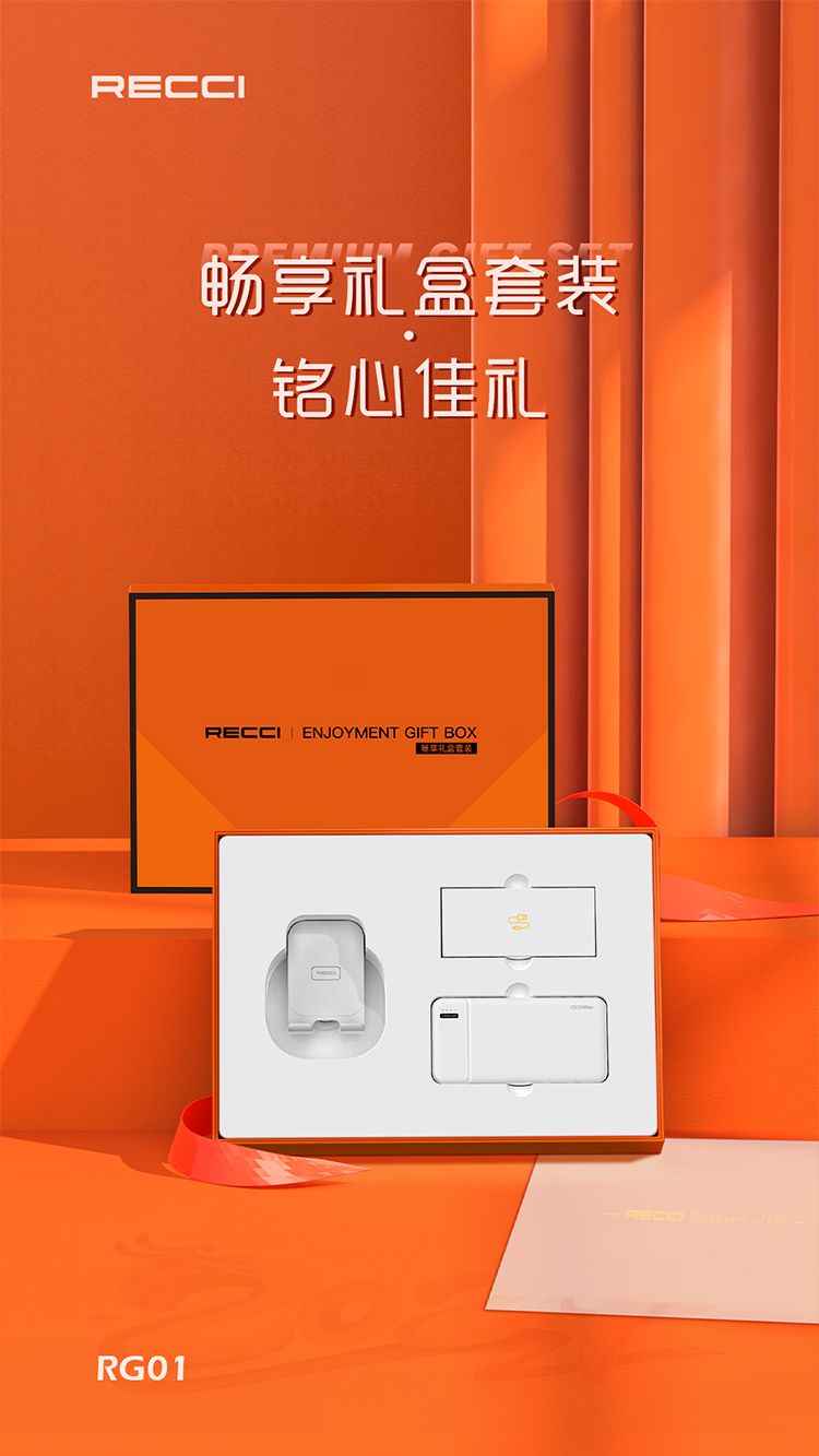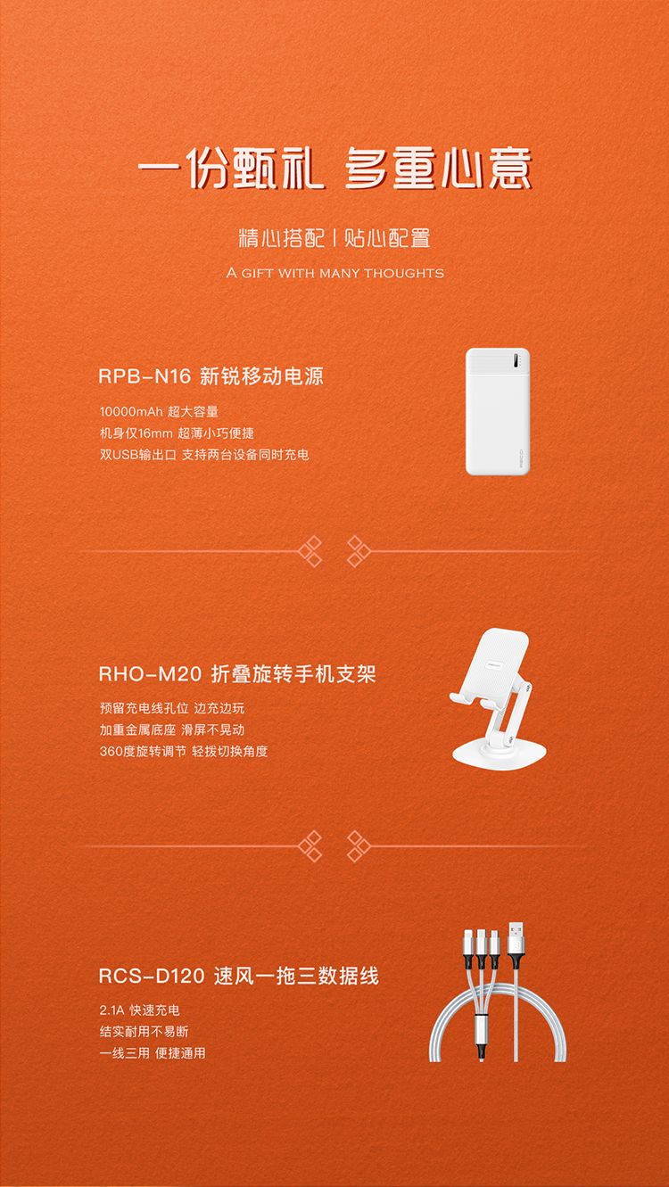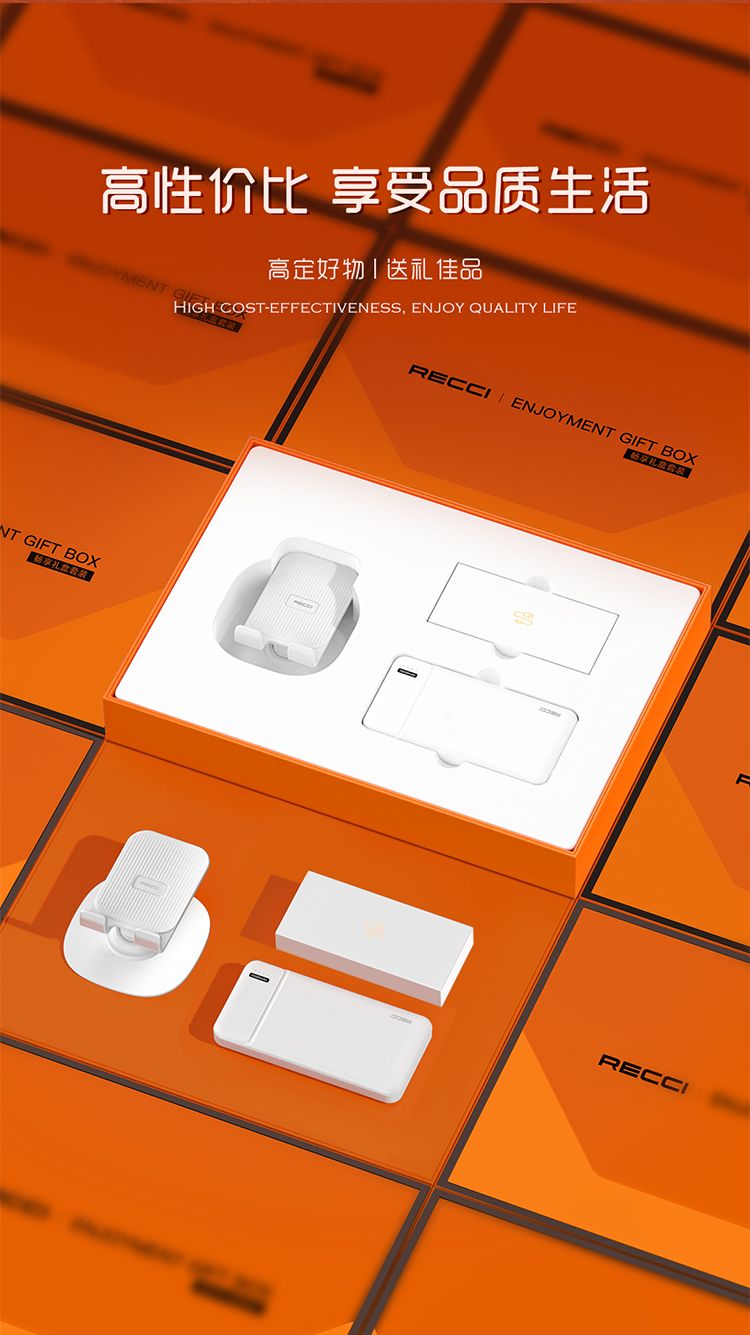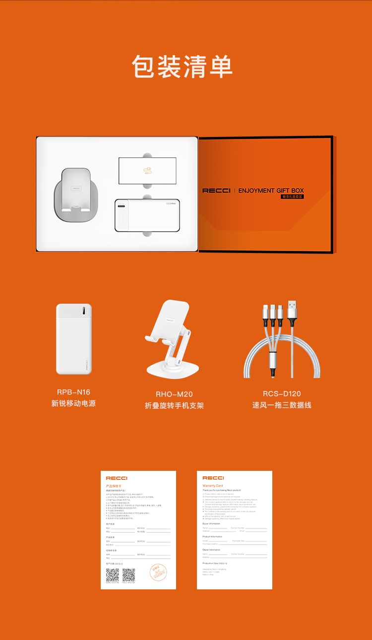 商品名称:RECCI锐思 畅享RG01礼盒 移动电源一万毫安+一拖三数据线+折叠旋转手机支架