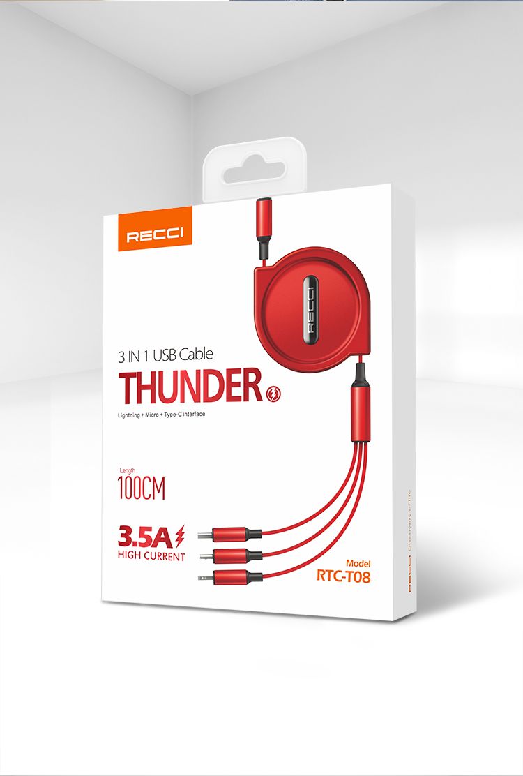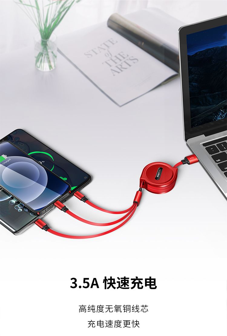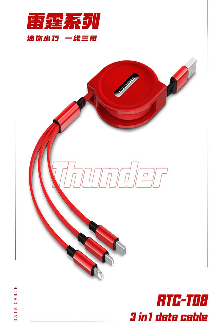 RECCI锐思Recci雷霆RTC-T08伸缩一拖三充电线4档拉伸长短随心不缠绕支持苹果安卓华为手机 红色
