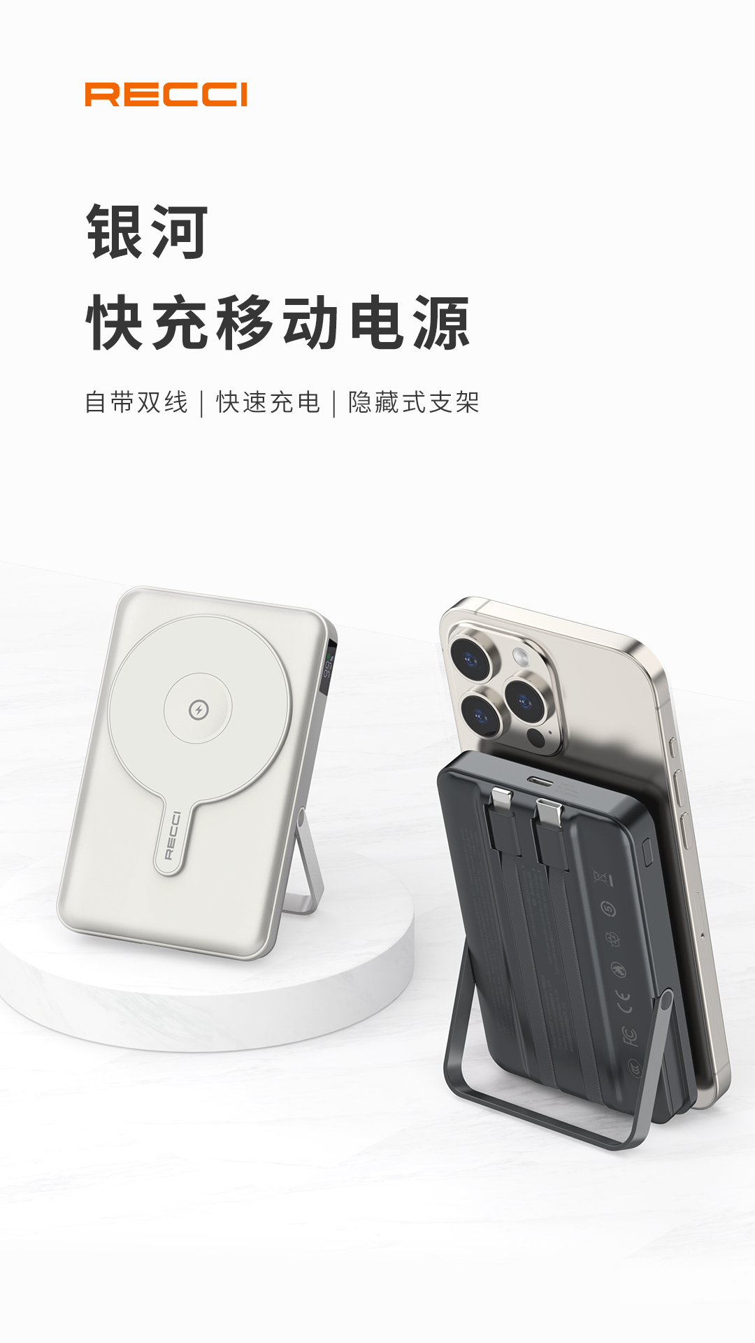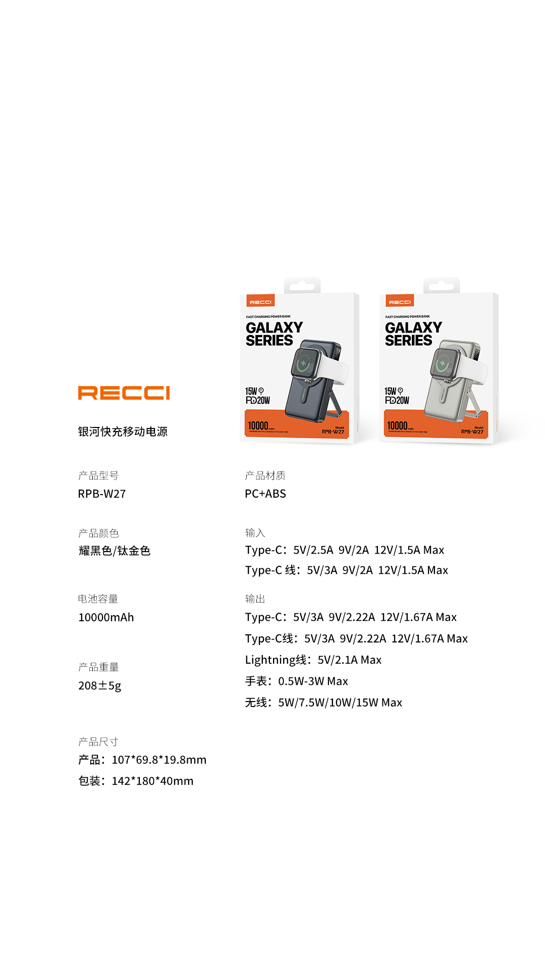 RECCI锐思RPB-W27移动电源一万毫安自带线快充PD20W充电宝10000mAh大容量支持苹果12/13/14/1