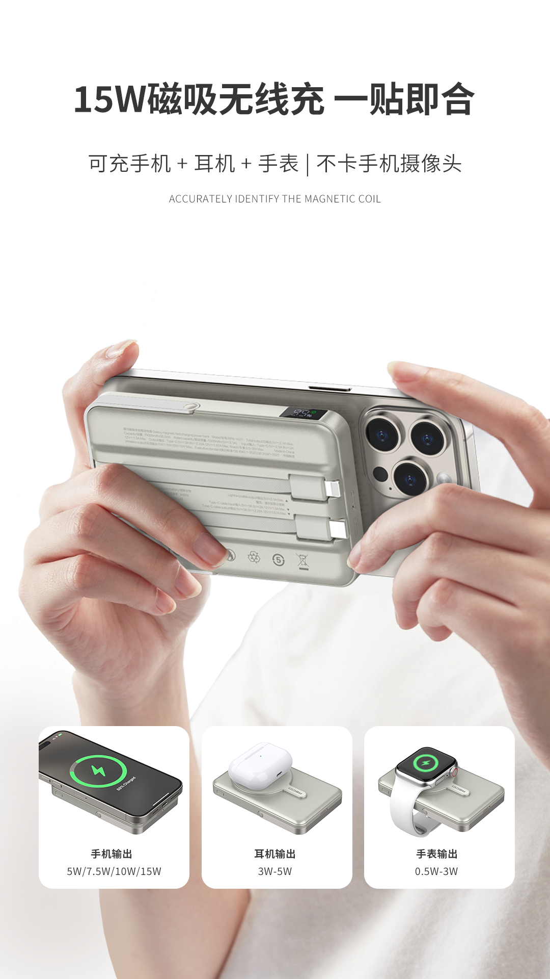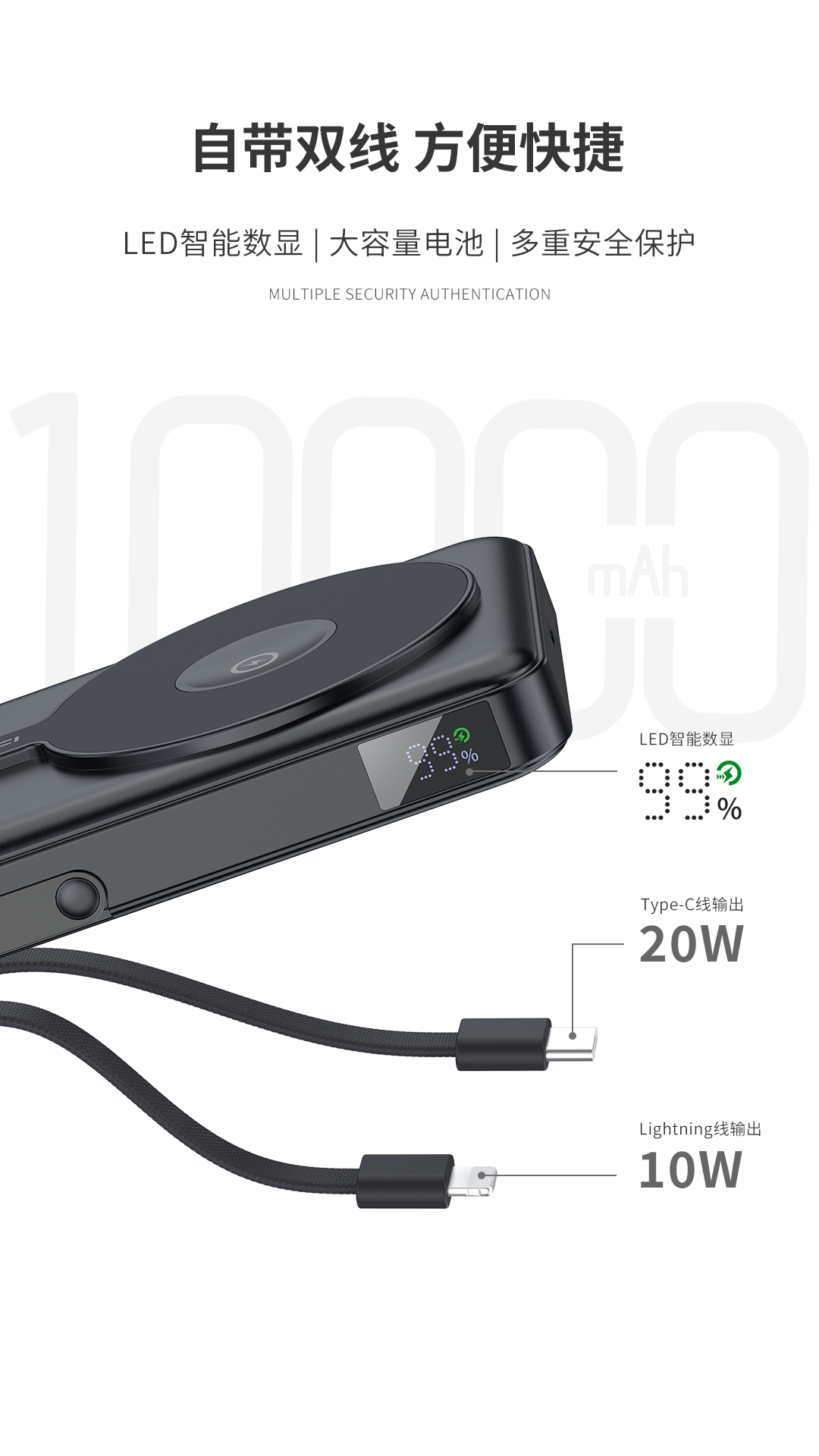 商品名称:RECCI锐思RPB-W27移动电源一万毫安自带线快充PD20W充电宝10000mAh大容量支持苹果12/13/14/1