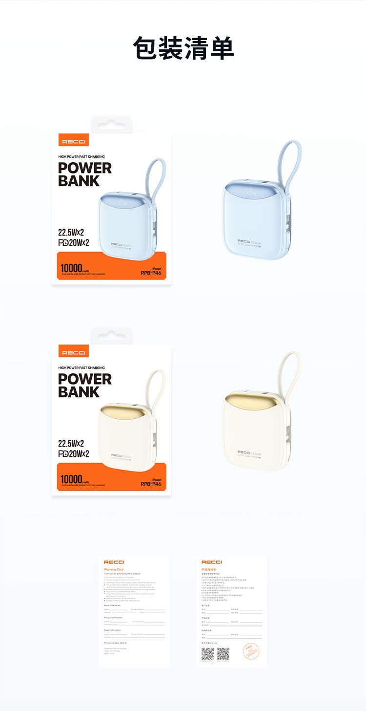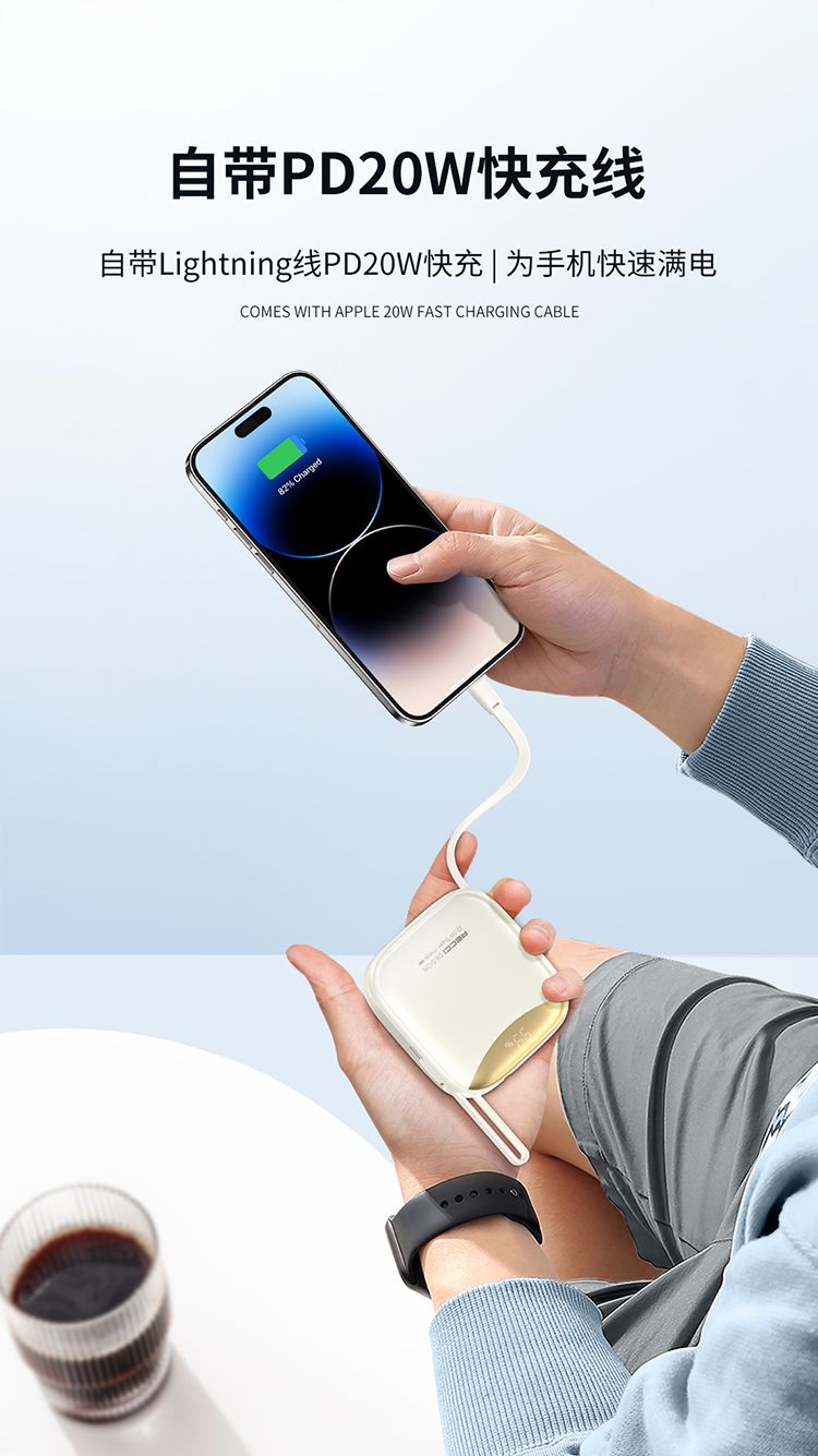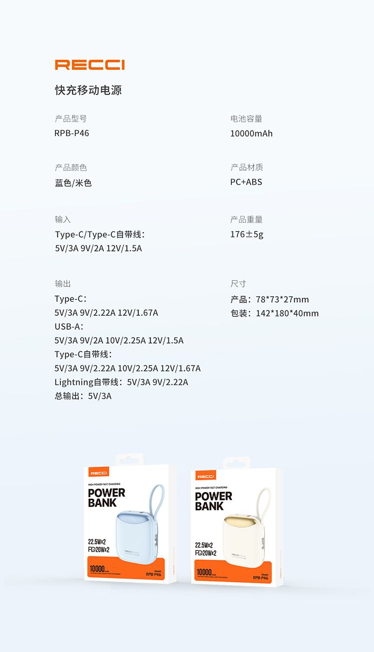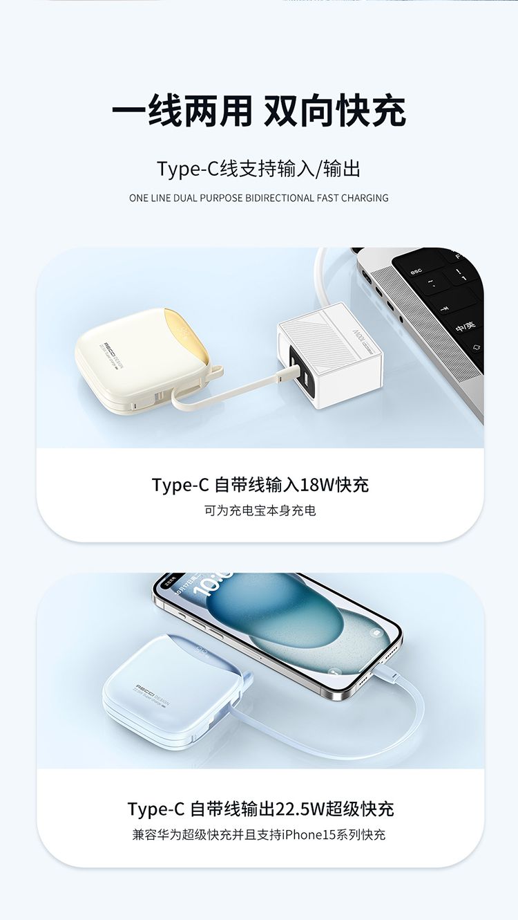 商品名称:RECCI锐思RPB-P46移动电源一万毫安PD快充自带线Type-C口支持苹果15兼容安卓充电宝 10000mAh