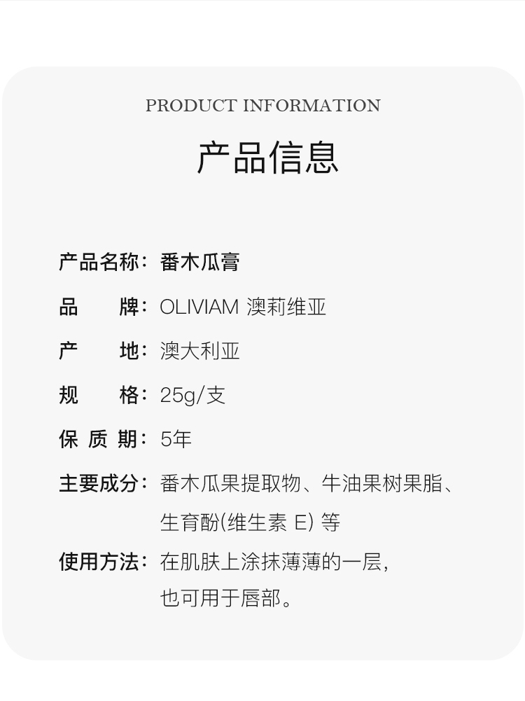 商品名称:Oliviam/澳莉维亚番木瓜膏25g*2支(本土版)