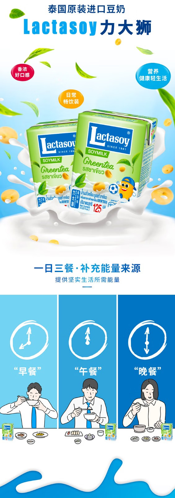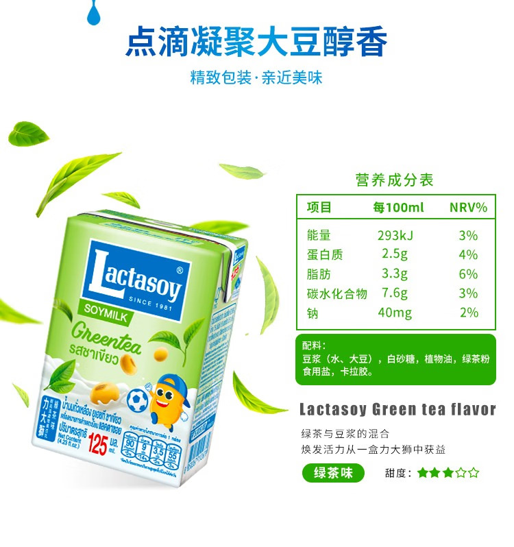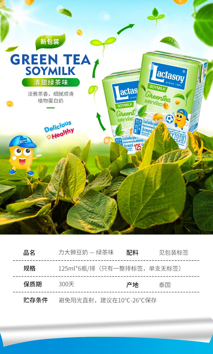 商品名称:Lactasoy/力大狮泰国进口绿茶味豆奶125ml*6瓶*3组
