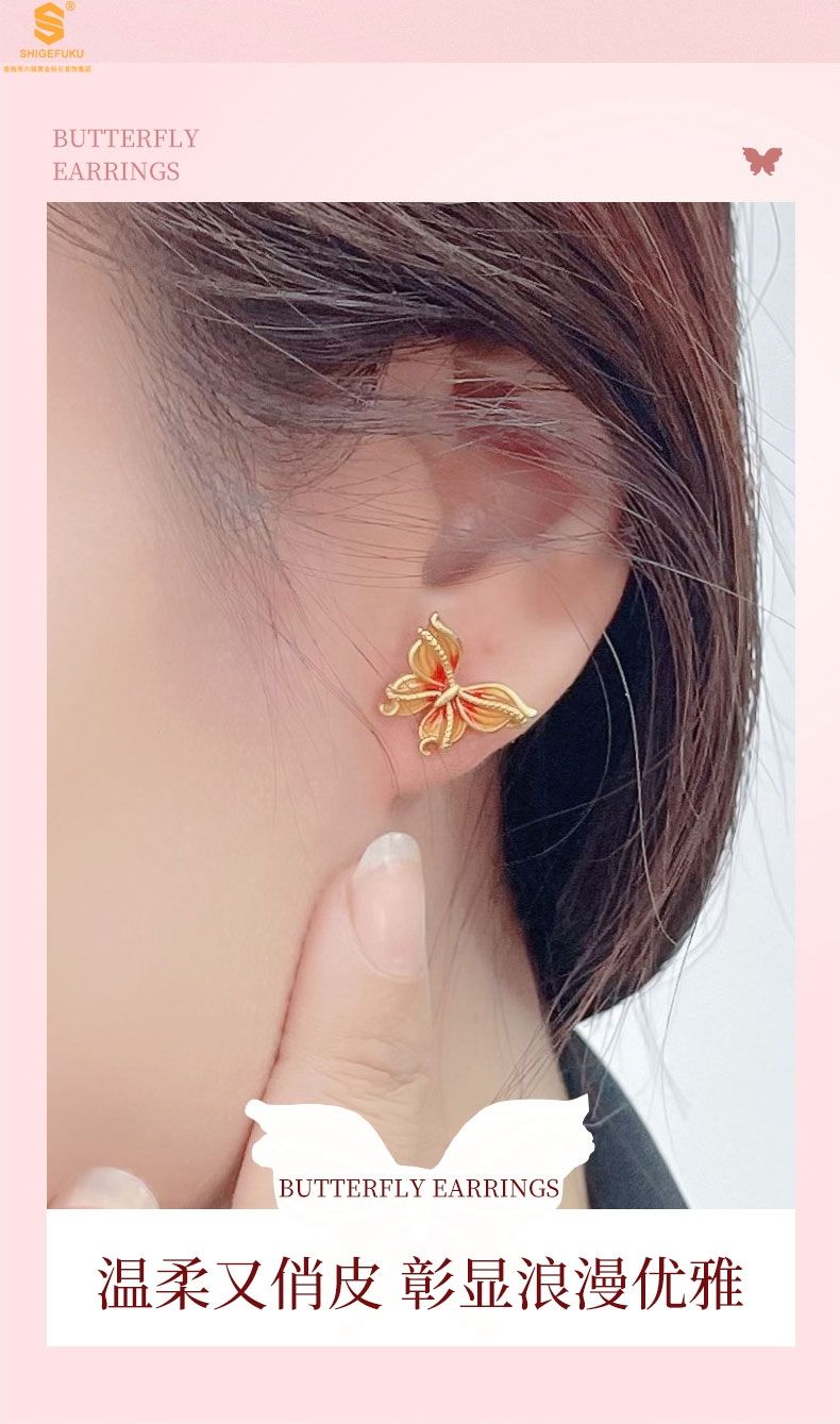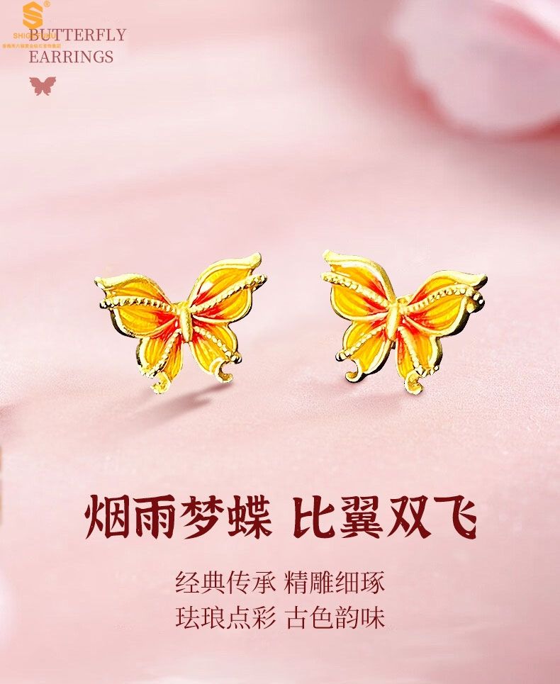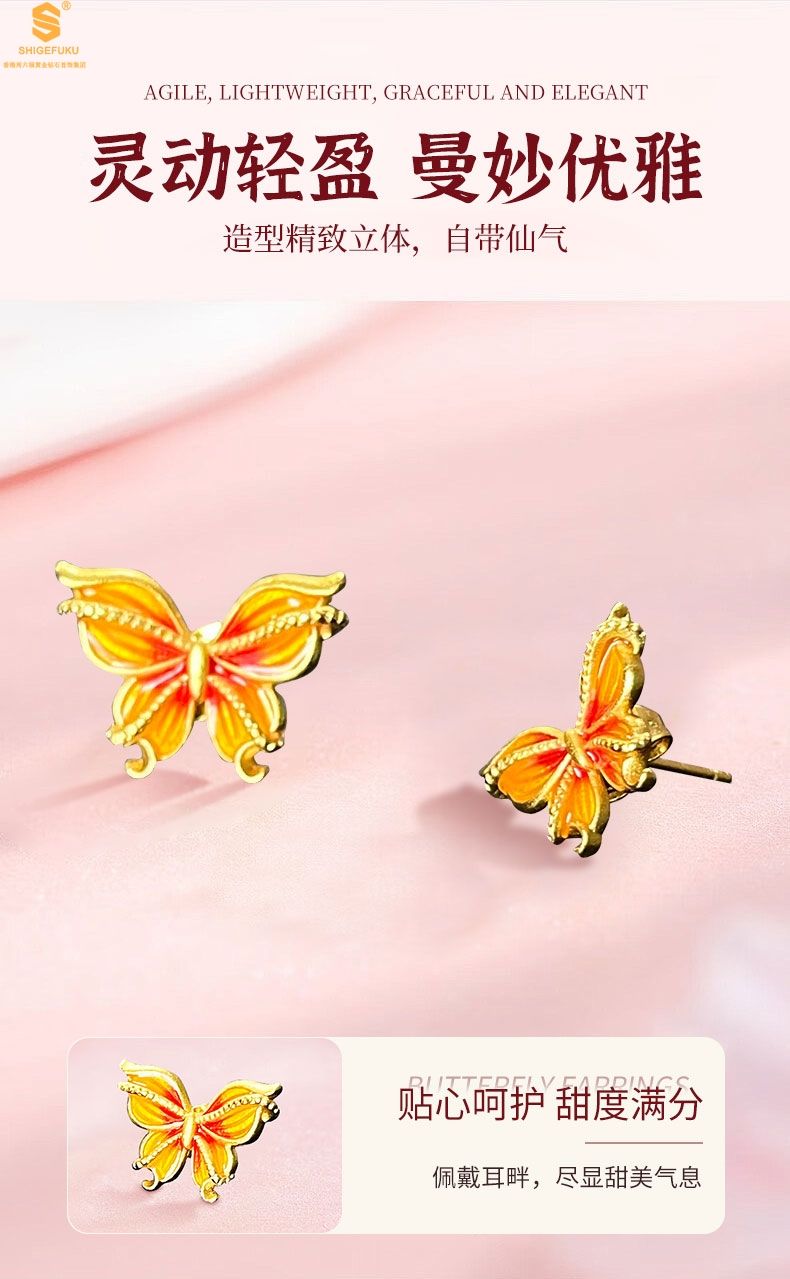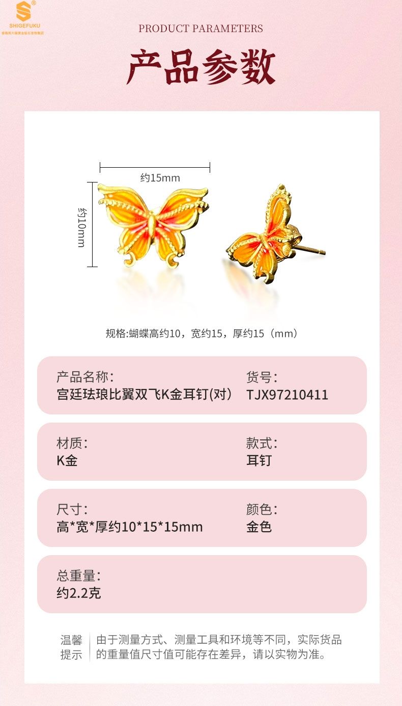 商品名称:香港周六福黄金钻石首饰宫廷珐琅比翼双飞K金耳钉