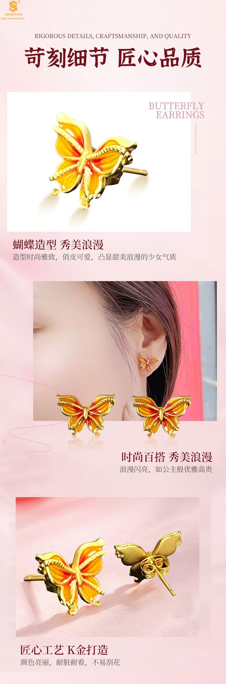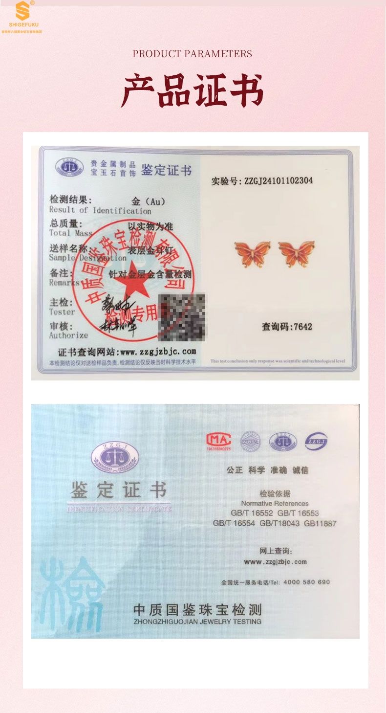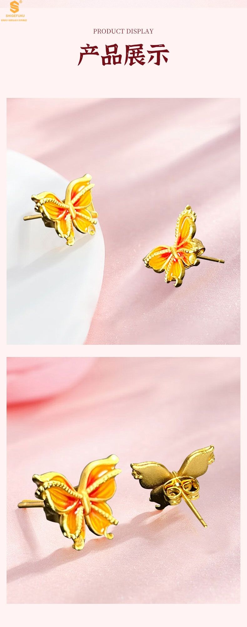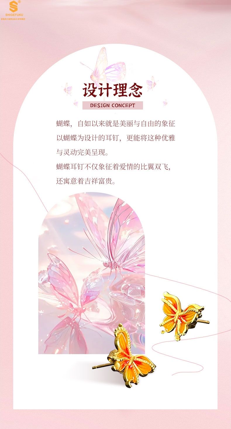 商品名称:香港周六福黄金钻石首饰宫廷珐琅比翼双飞K金耳钉