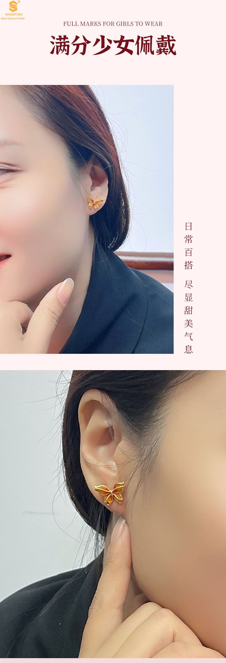 香港周六福黄金钻石首饰宫廷珐琅比翼双飞K金耳钉