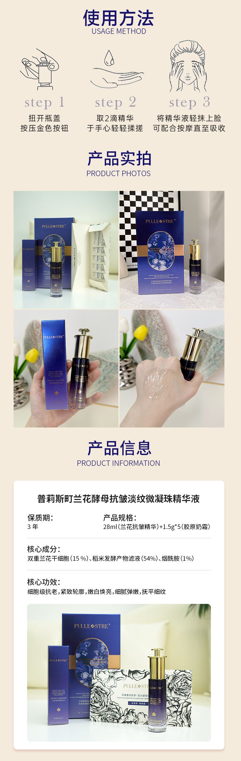 商品名称:PULLE STRE/普莉斯町 兰花酵母微凝珠精华液28ml/瓶【下单额外加赠奶霜小样2片】