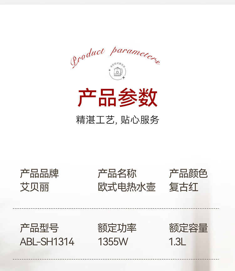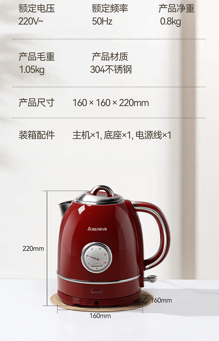 商品名称:ABEREVE/艾贝丽1.3升欧式电热水壶-复古红ABL-SH1314