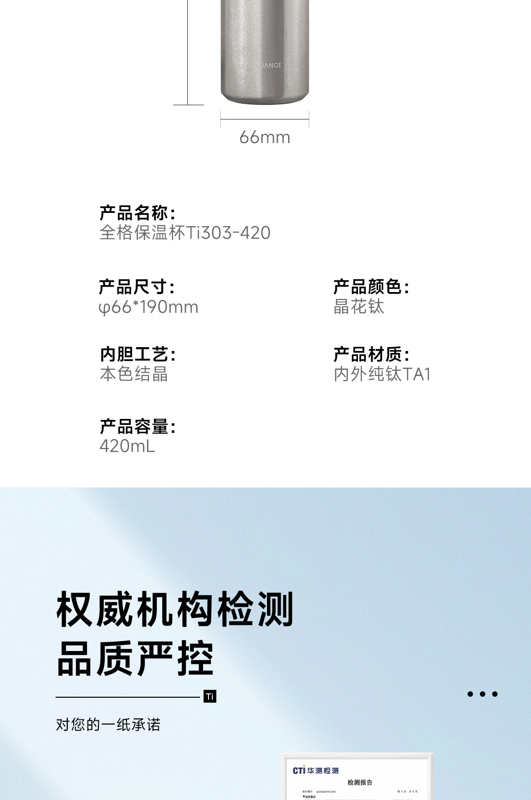 商品名称:Quange/全格420毫升全格保温杯-晶花钛Ti303-420