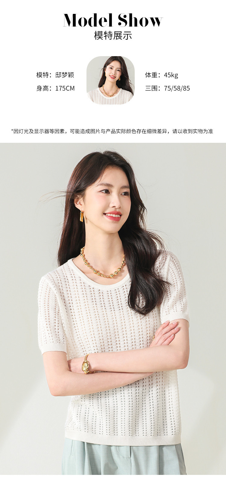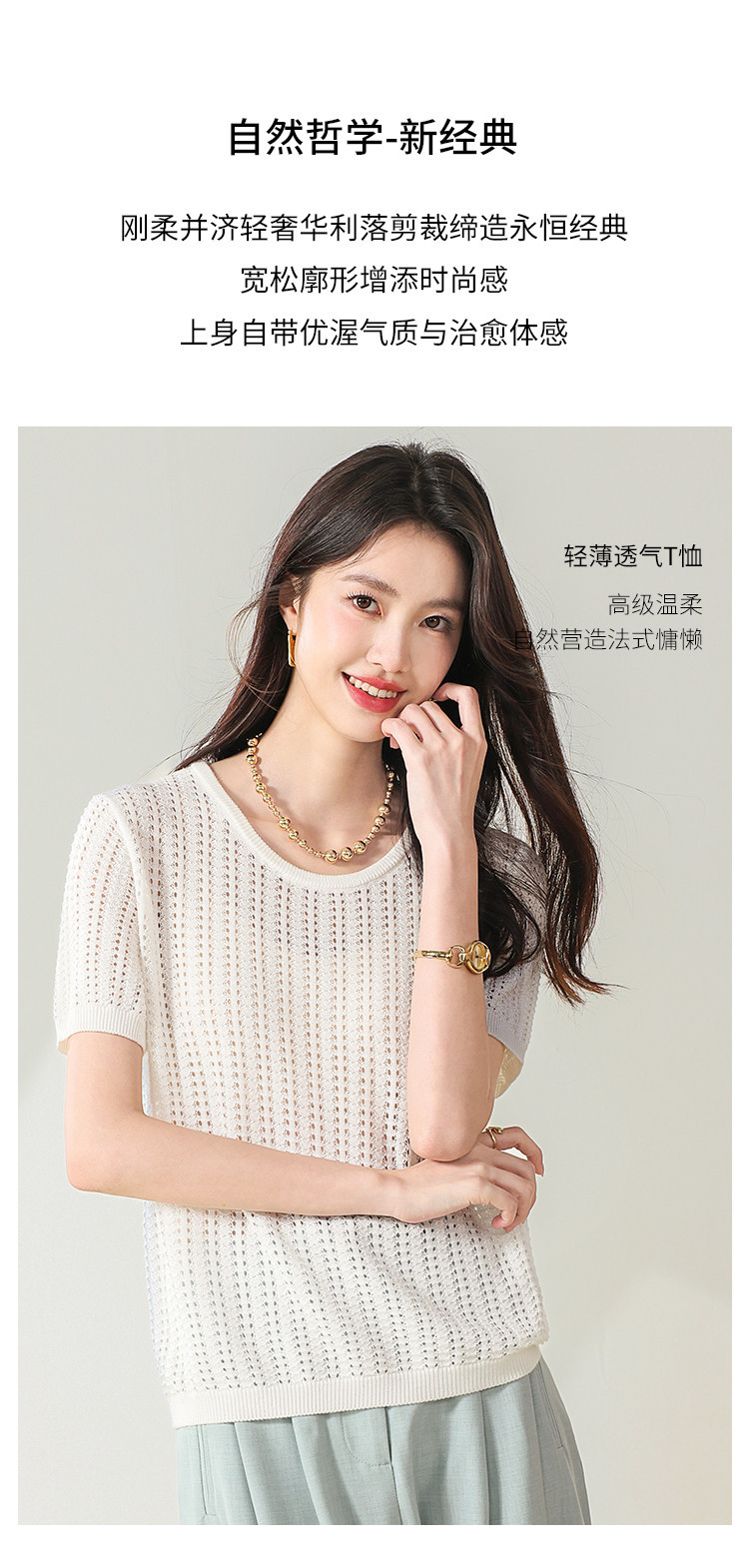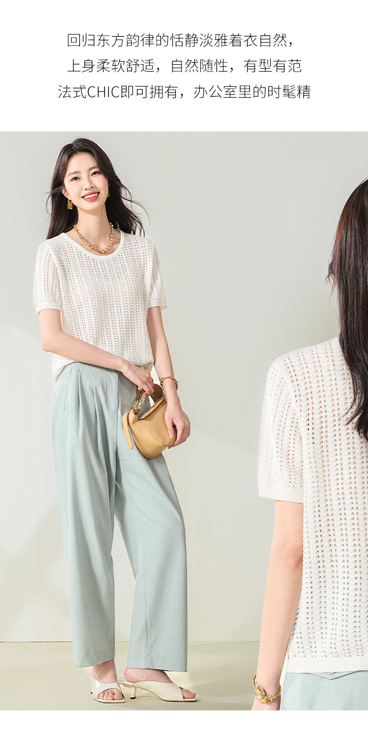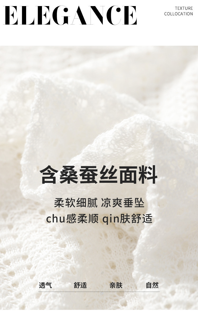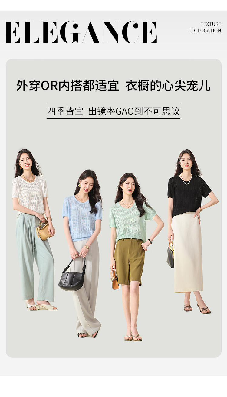 商品名称:【含桑蚕丝】轻薄透气圆领镂空针织打底短袖T恤 304403