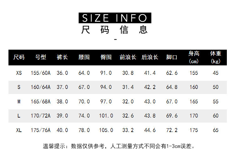 | 尺码 | 后浪(cm) | 裤脚围(cm) | 腰围(cm) | 裤长(cm) | 前浪(cm) | 臀围(cm) | 号型 |