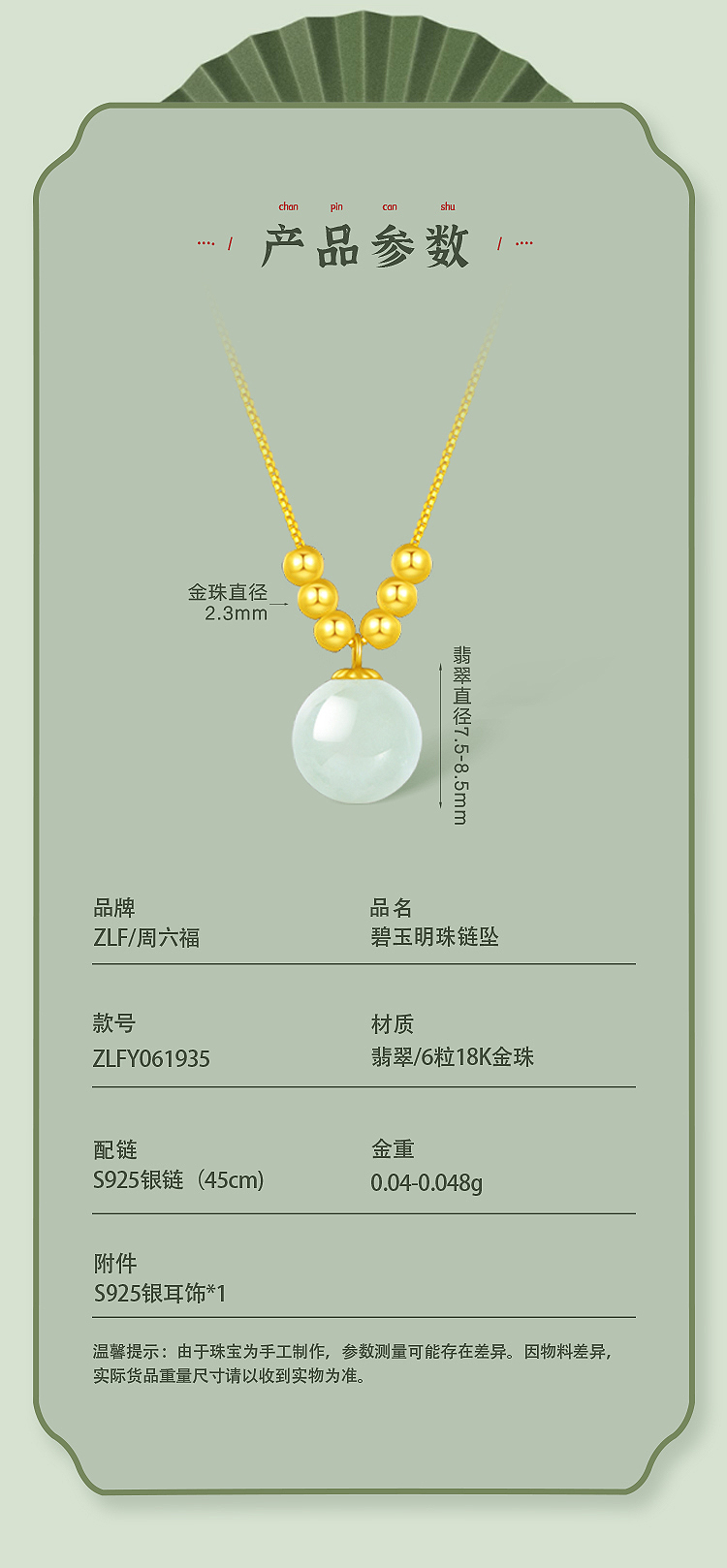 商品名称:周六福翡翠明珠项链+18K金珠ZLFY061935
