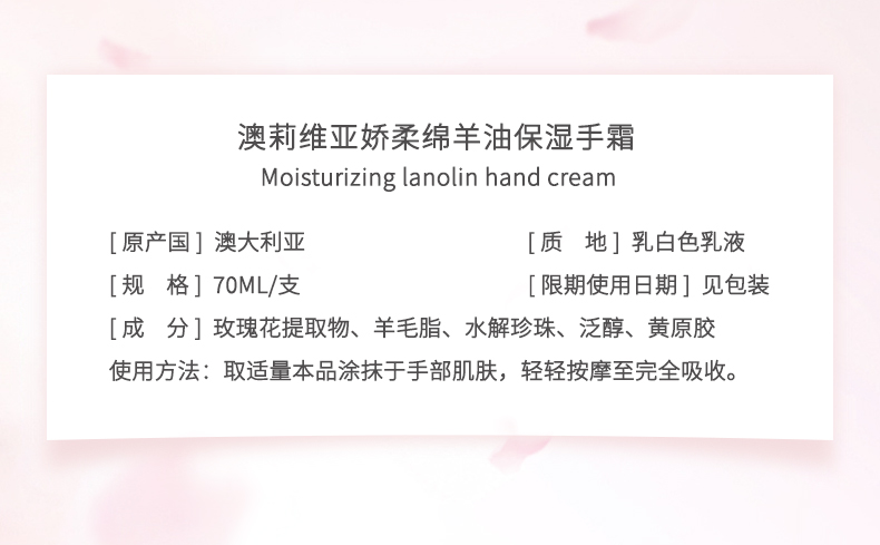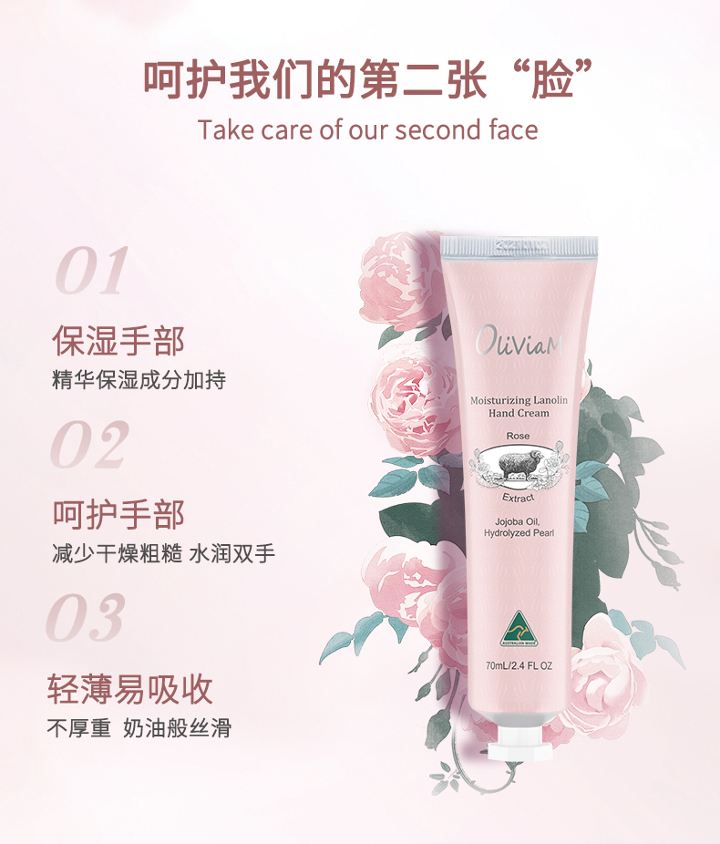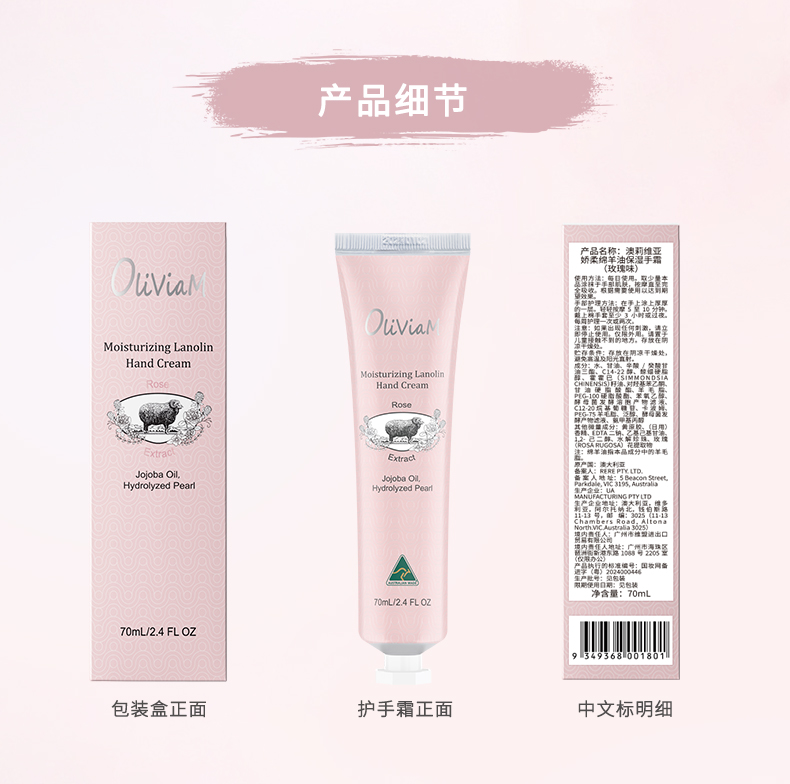 商品名称:Oliviam/澳莉维亚玫瑰味娇柔绵羊油保湿手霜70ml*2支(本土版)