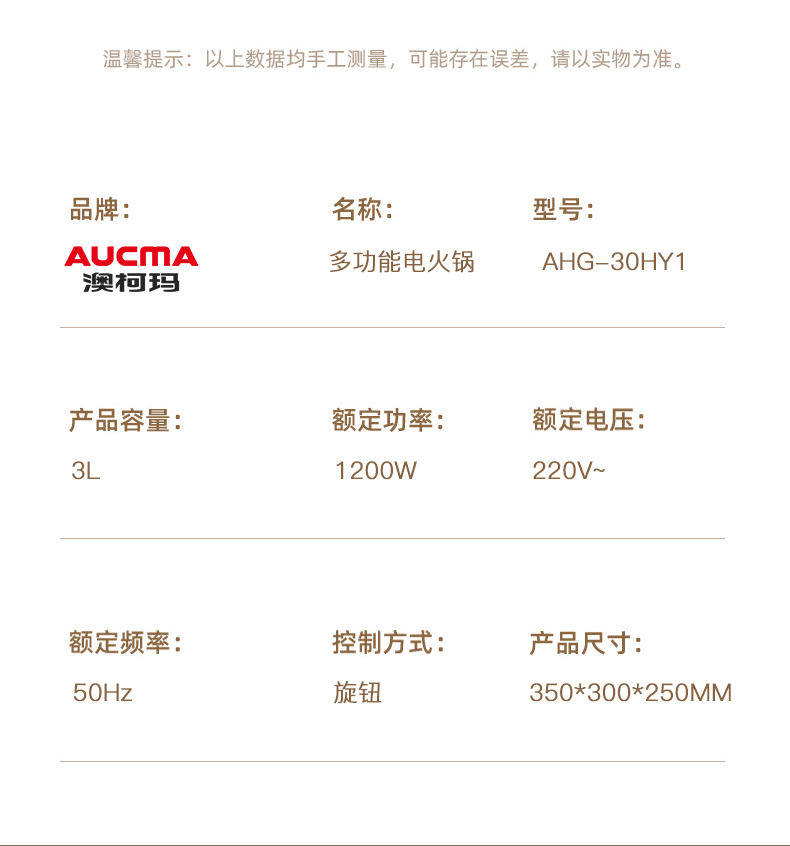 商品名称:AUCMA/澳柯玛3升多功能电火锅AHG-30HY1