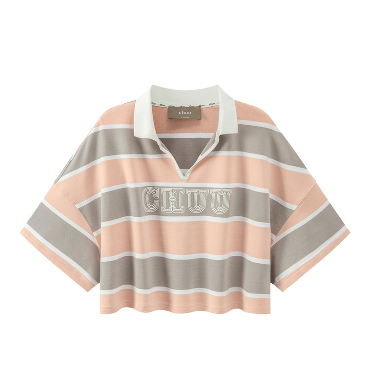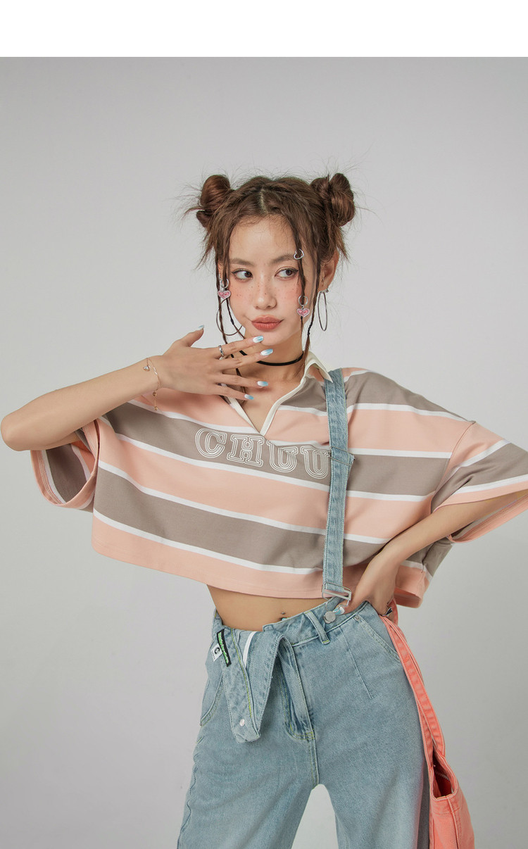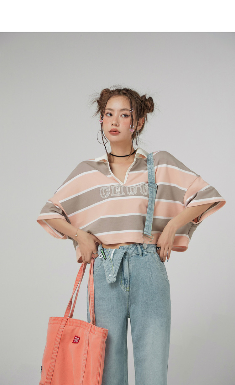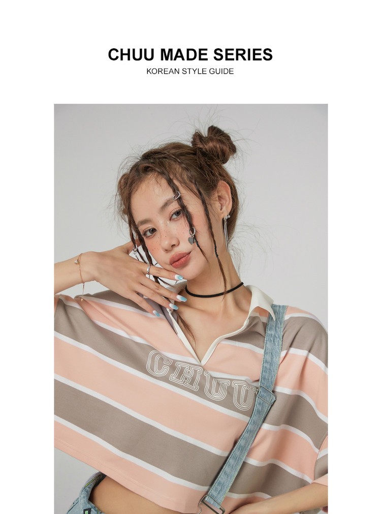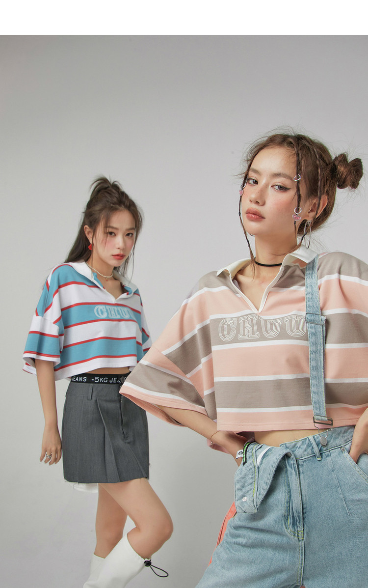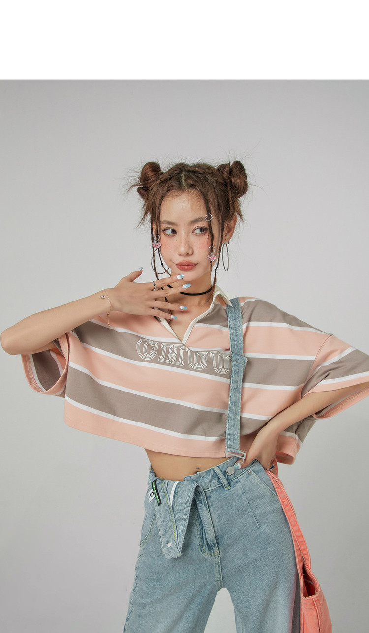 撞色条纹POLO领短袖T恤女夏宽松短上衣 428563