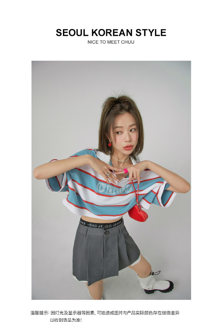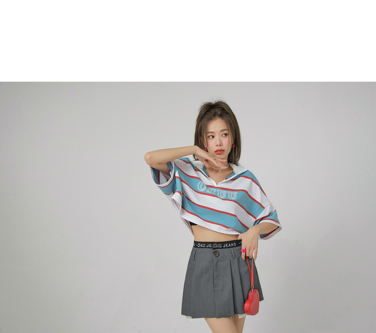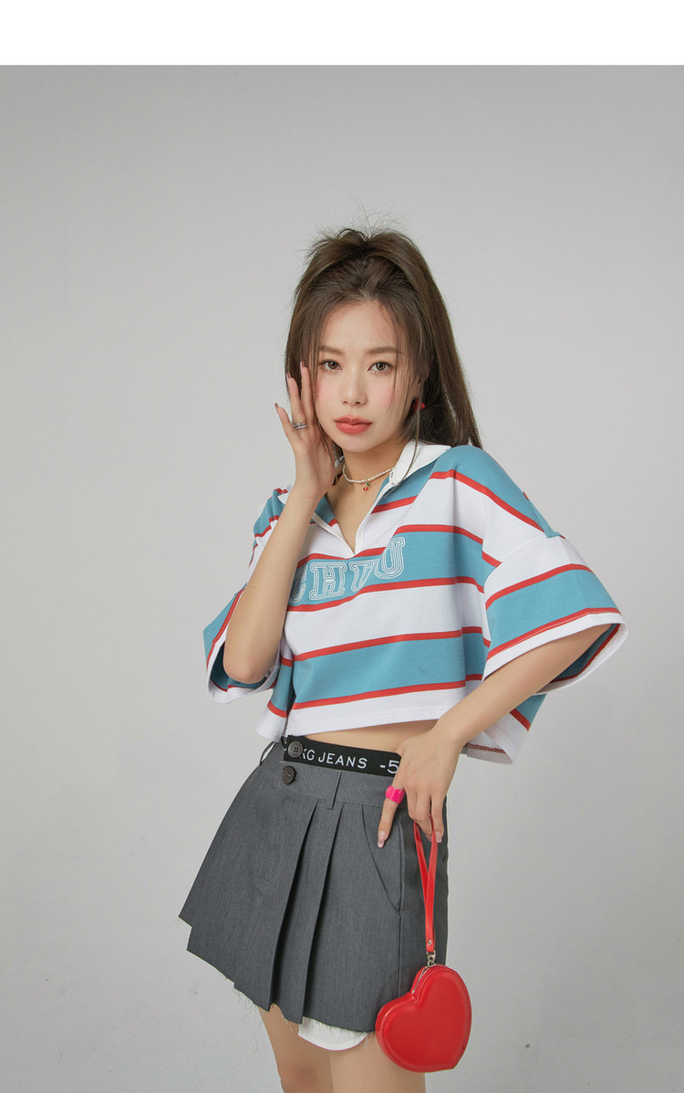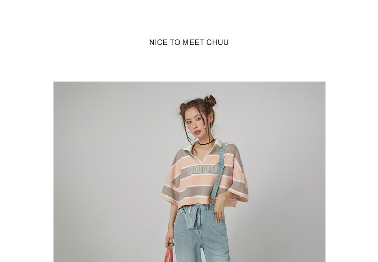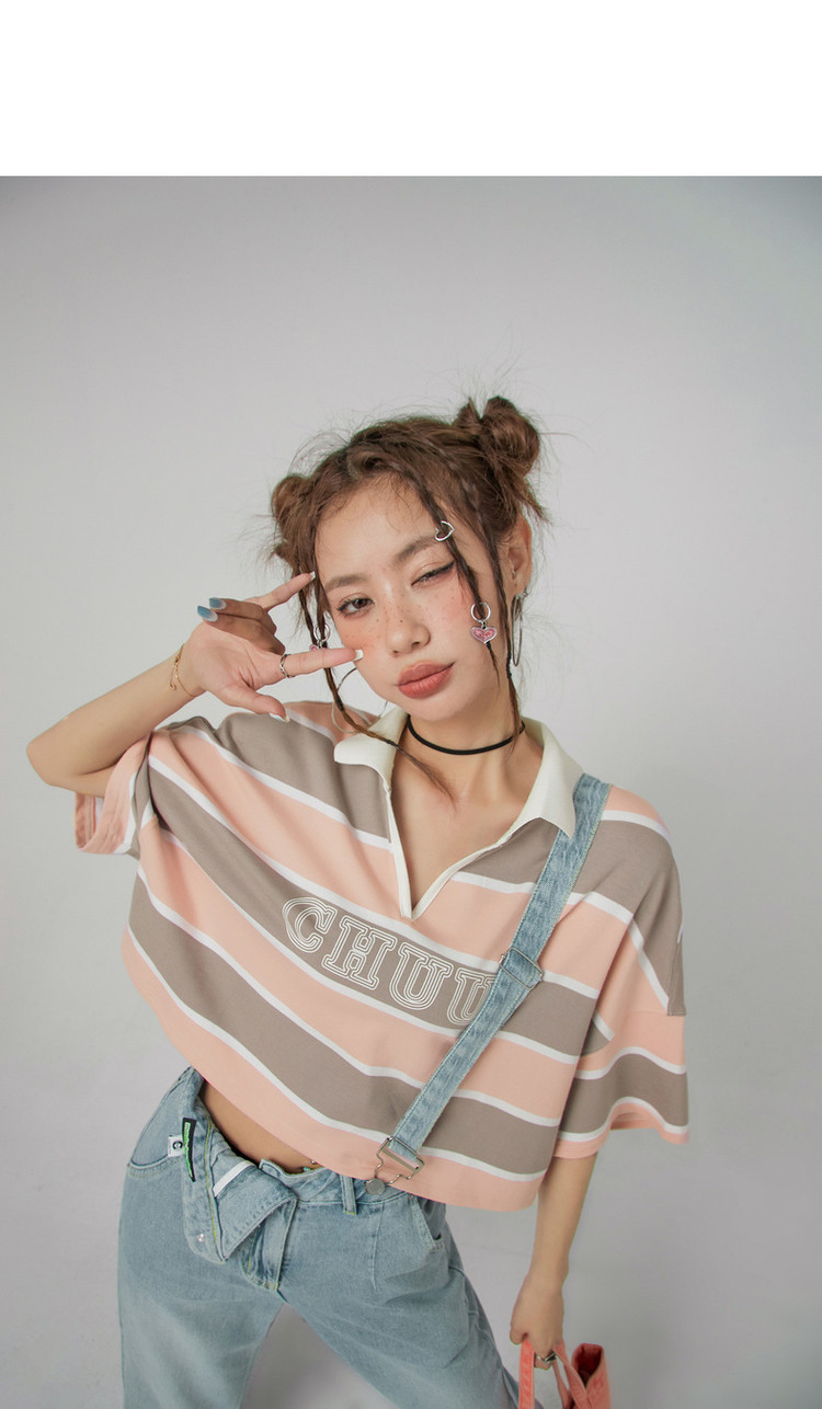 商品名称:撞色条纹POLO领短袖T恤女夏宽松短上衣 428563