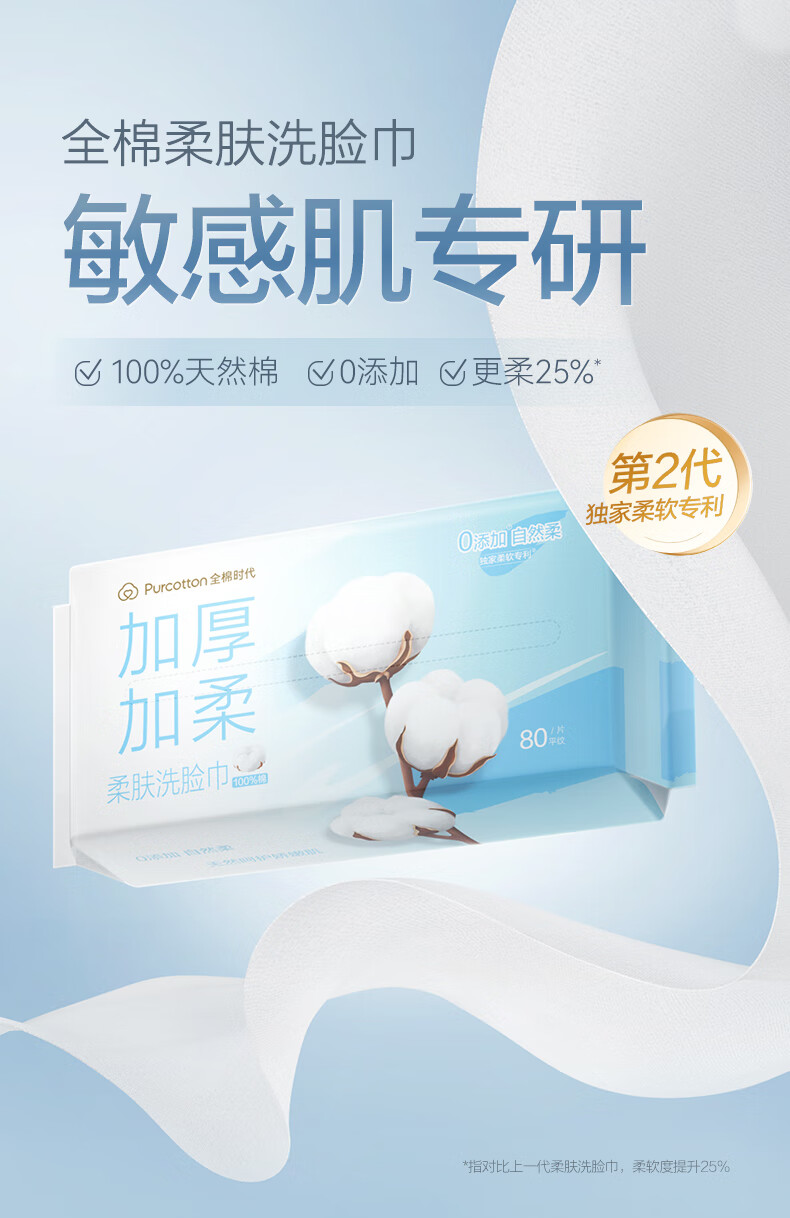 Purcotton/全棉时代加厚加柔柔肤洗脸巾80片*3包
