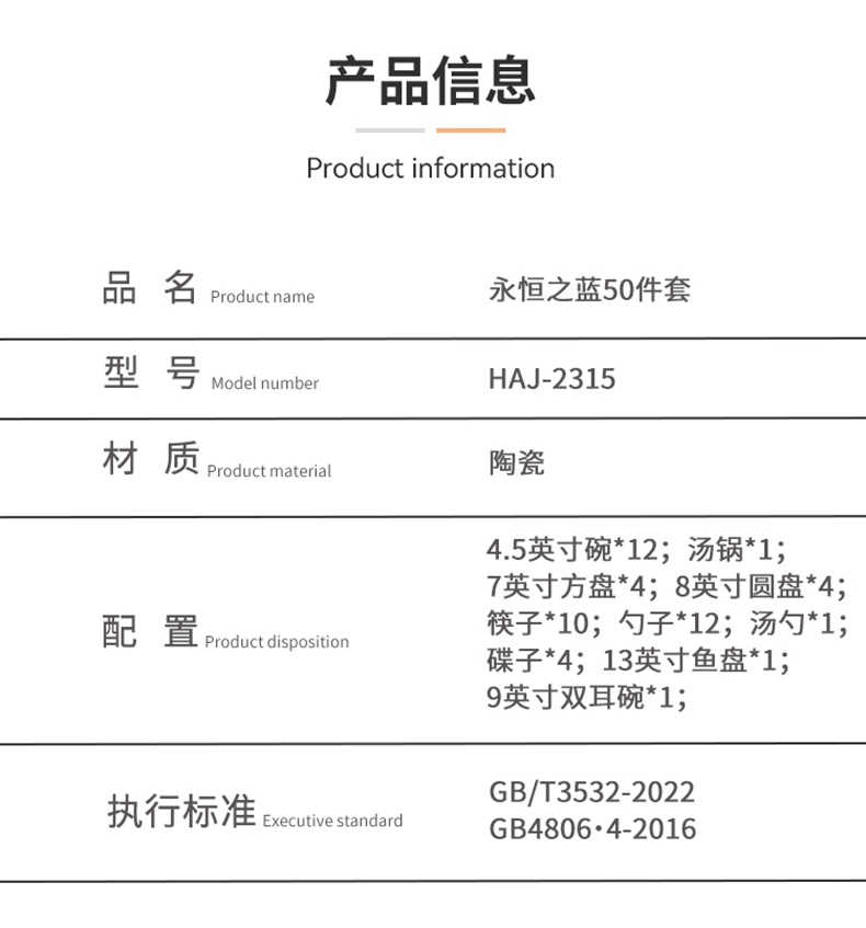 商品名称:HOAIJA/豪爱佳永恒之蓝餐具50件套HAJ-2315