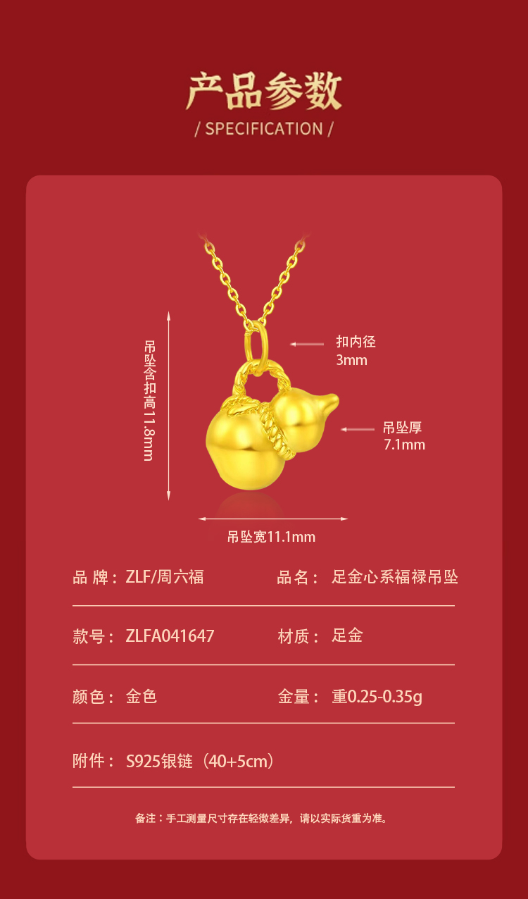 周六福足金心系福禄吊坠ZLFA041647