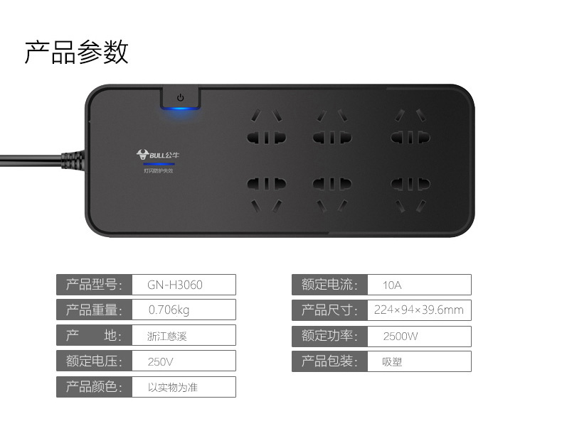 商品名称:BULL/公牛抗电涌六位五孔插座GN-H3060